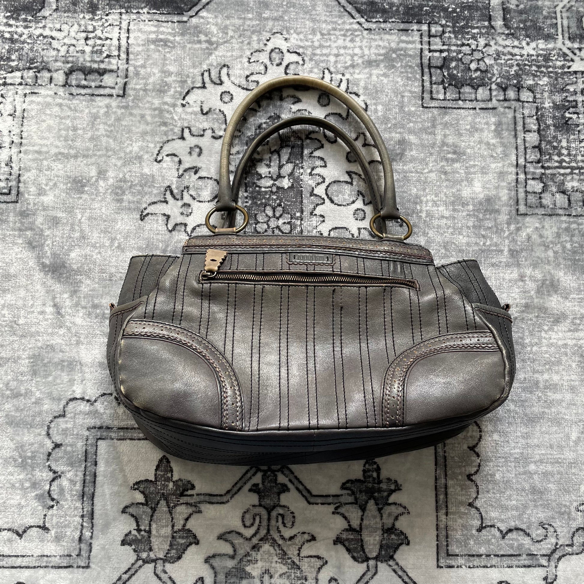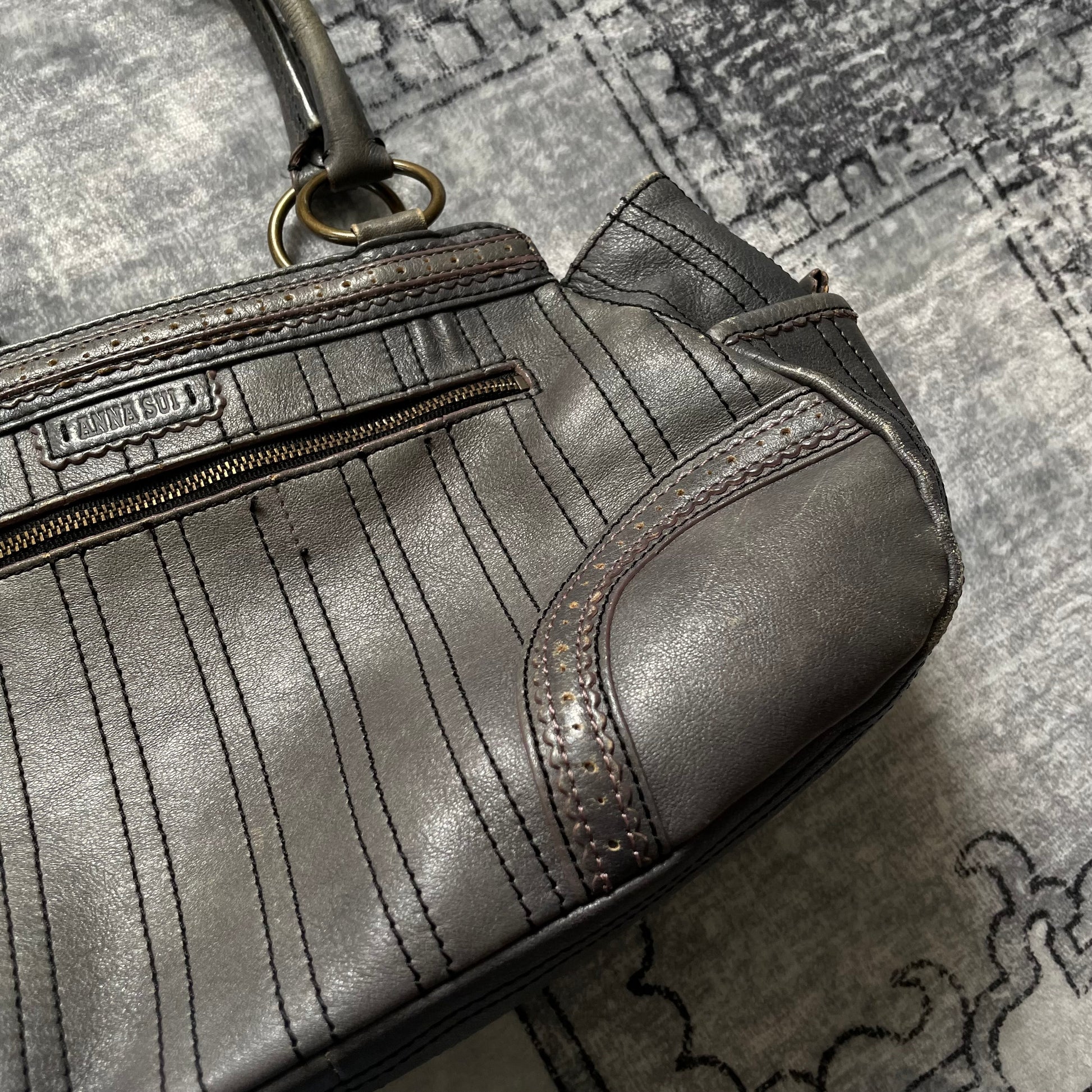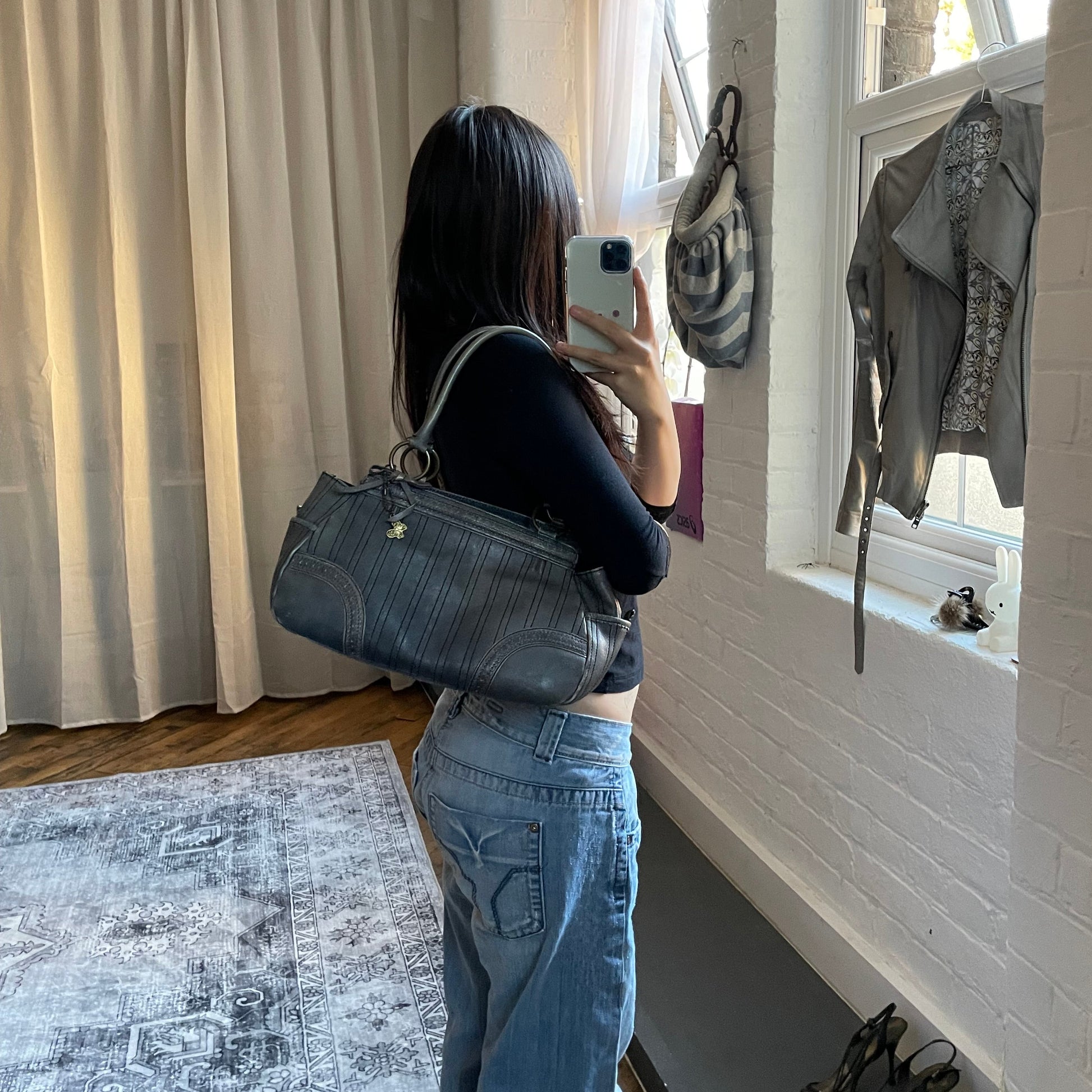 anna sui faded denim grey panelled shoulder bag with ribbon bow detail + brass hardware and butterfly charm