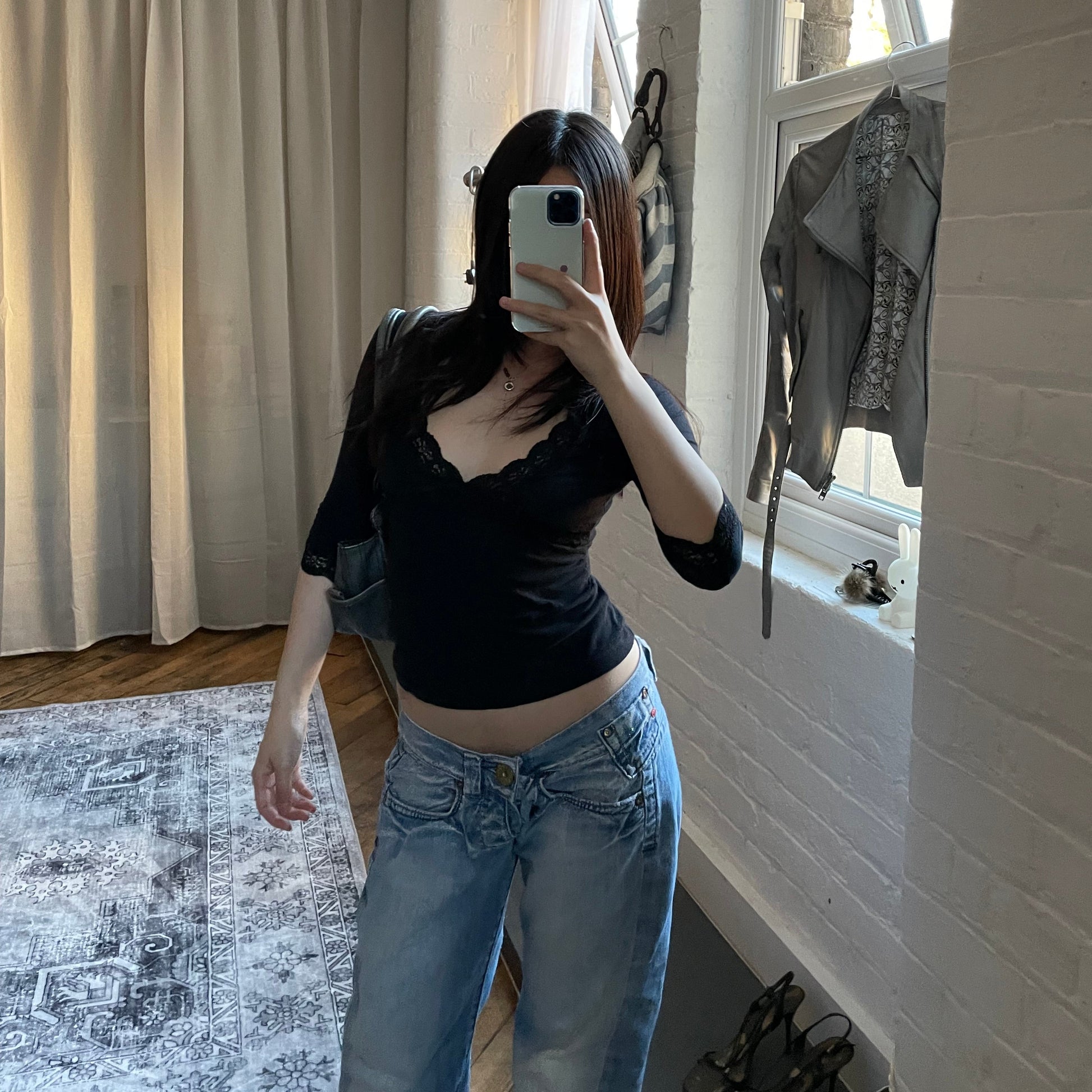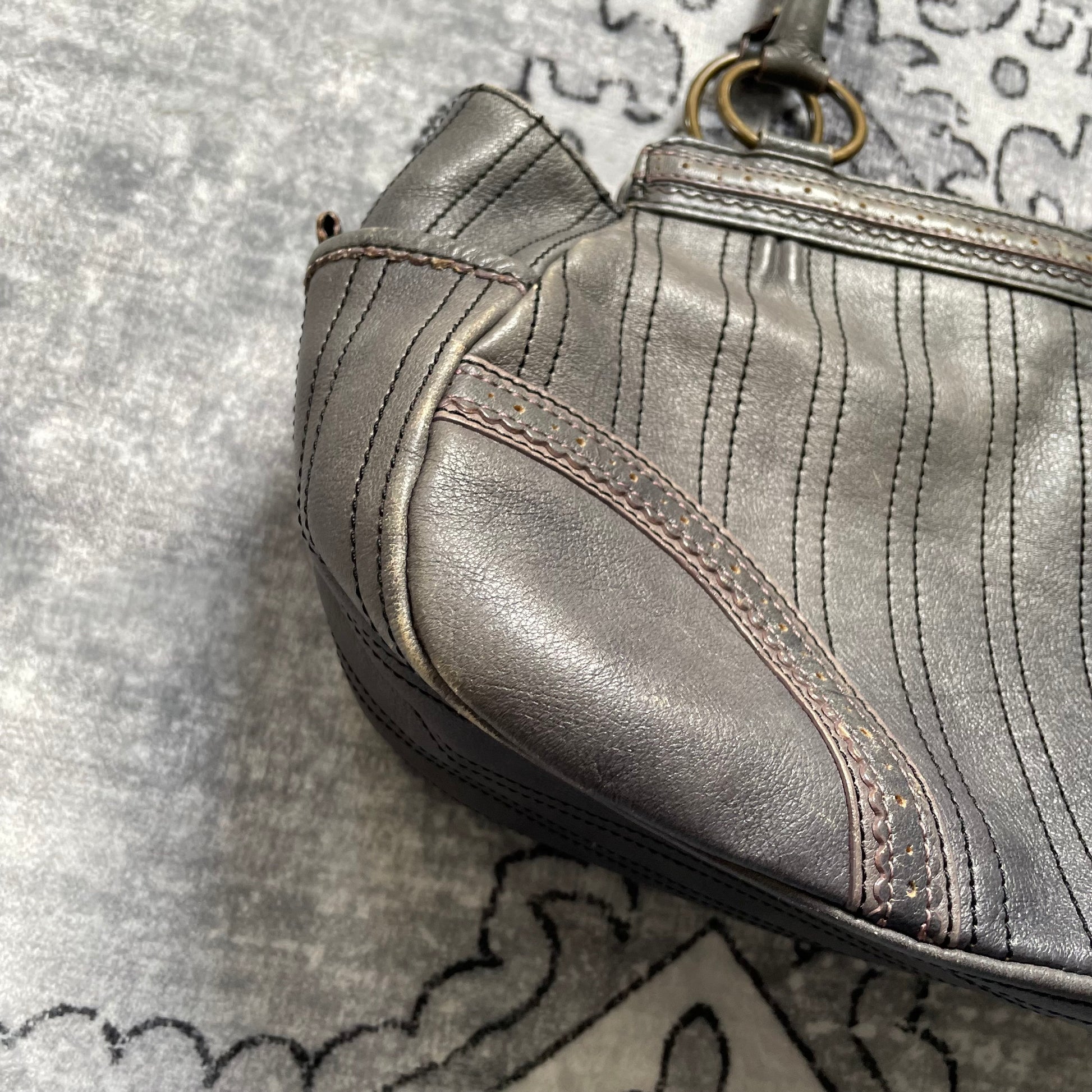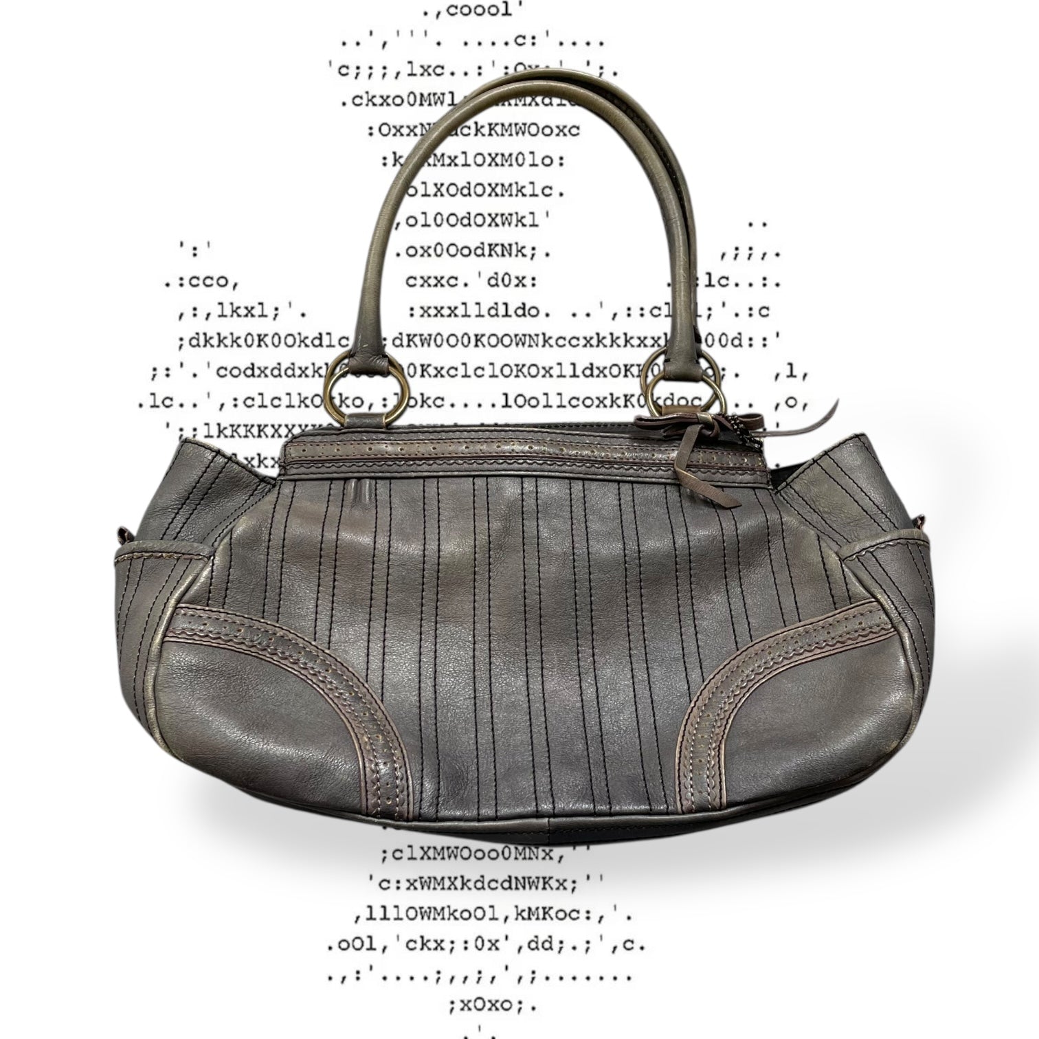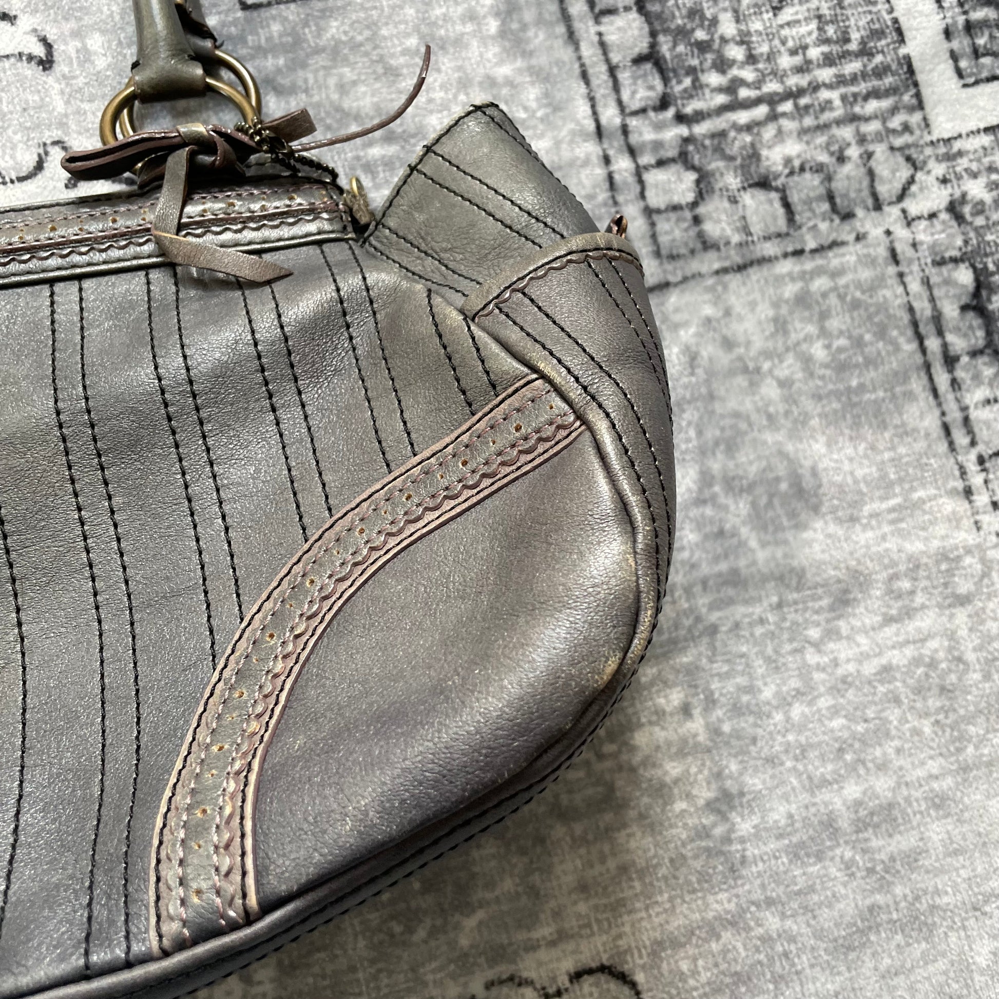 anna sui faded denim grey panelled shoulder bag with ribbon bow detail + brass hardware and butterfly charm