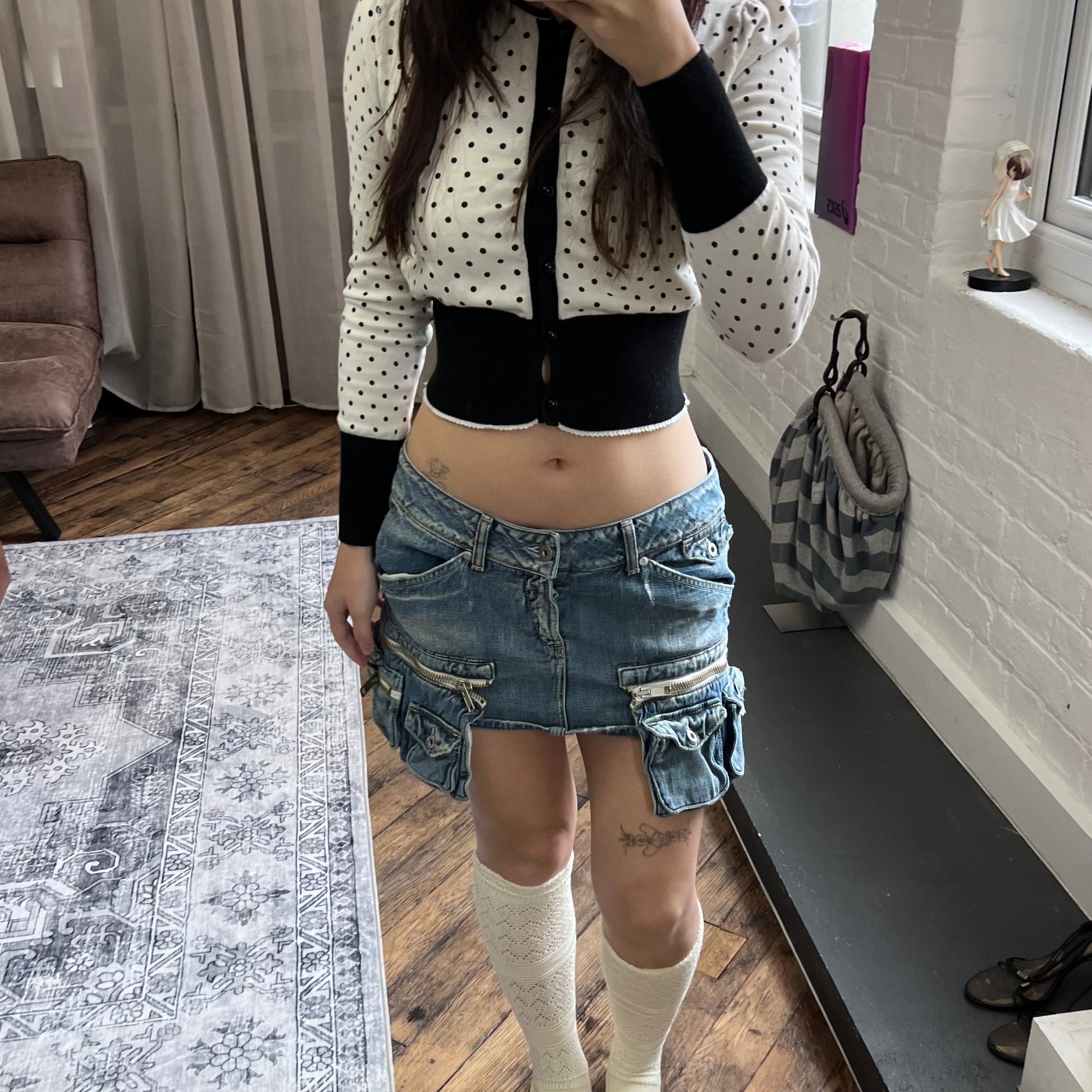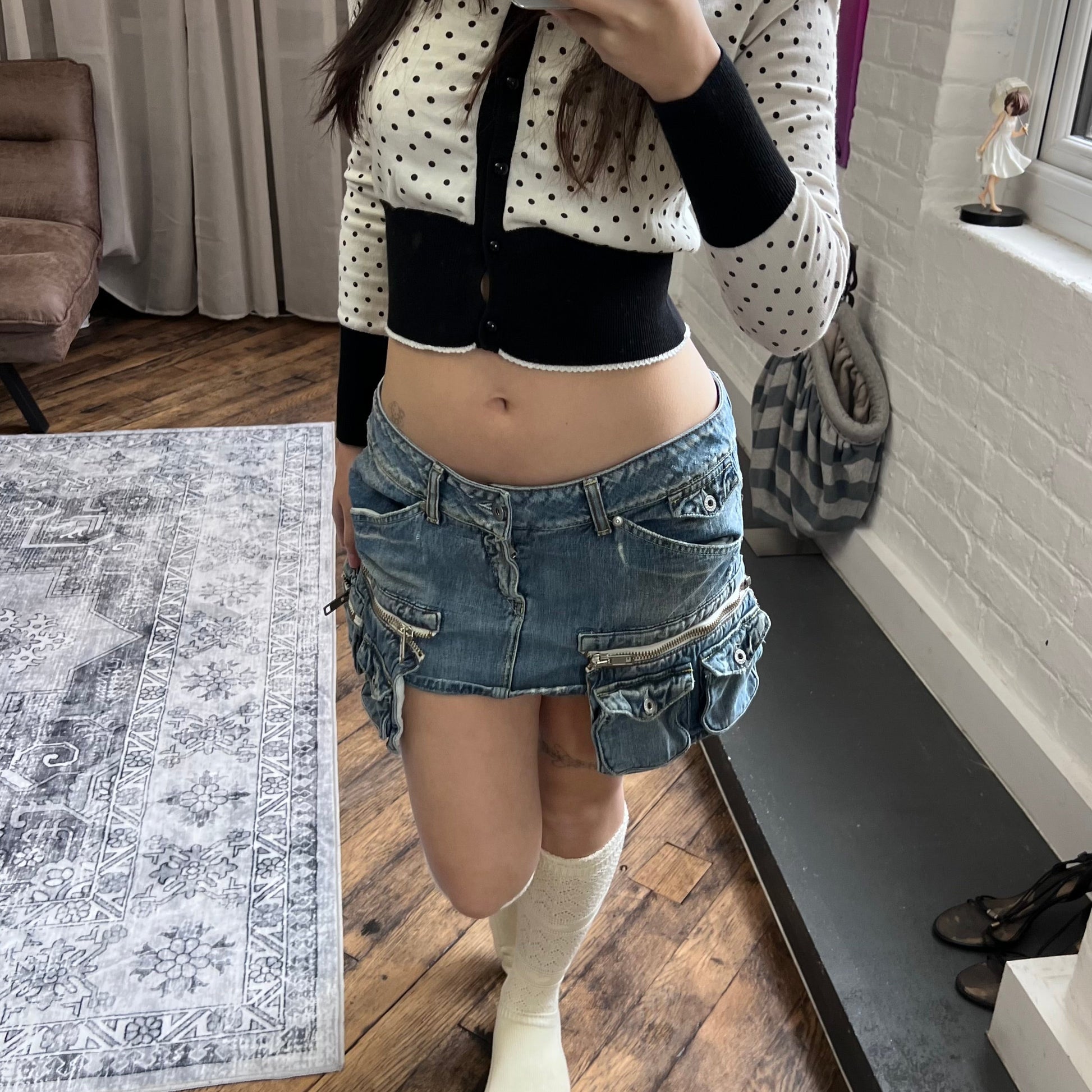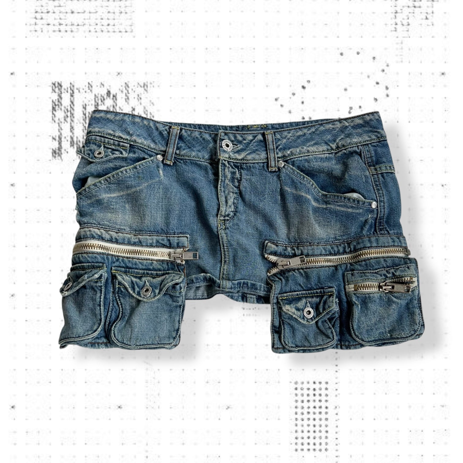 baci denim light wash utility deconstructed hanging zip pocket cargo denim mini skirt