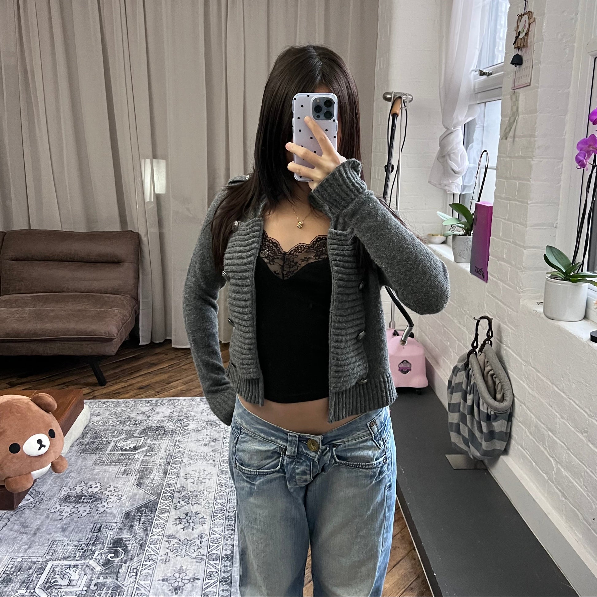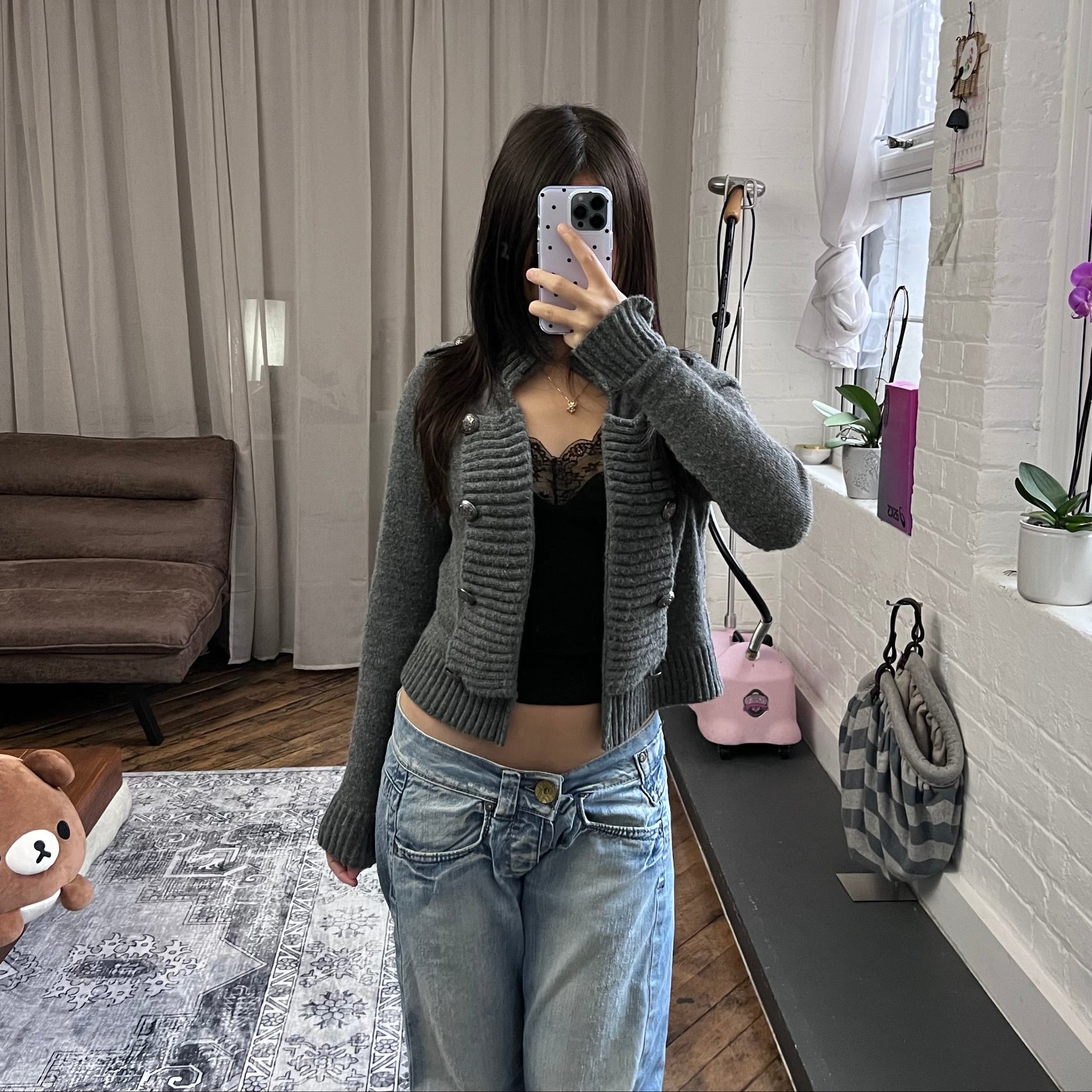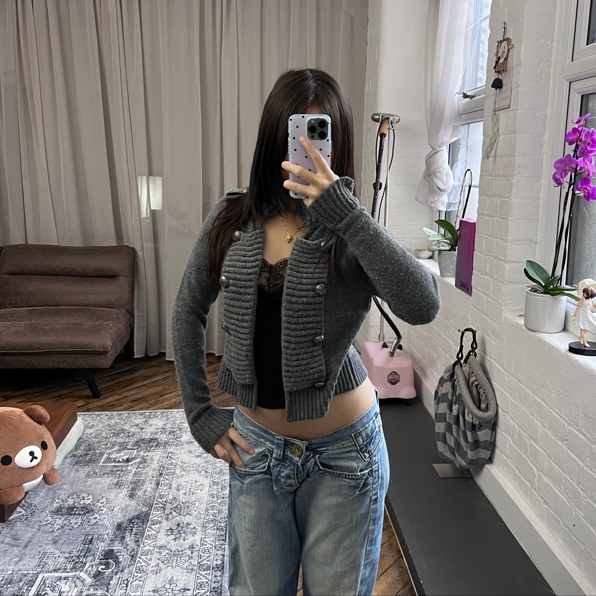 bonobo jeans dark grey collared crop round button open bolero cardigan knit jacket