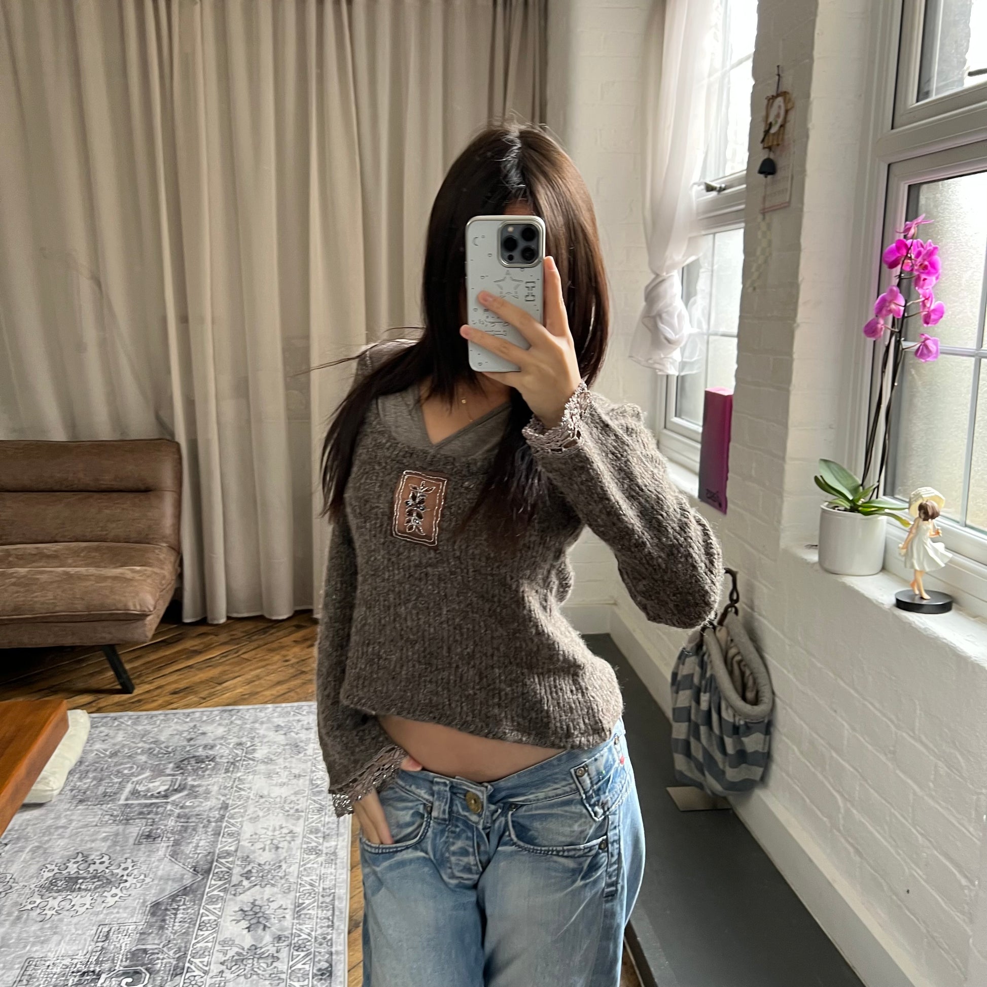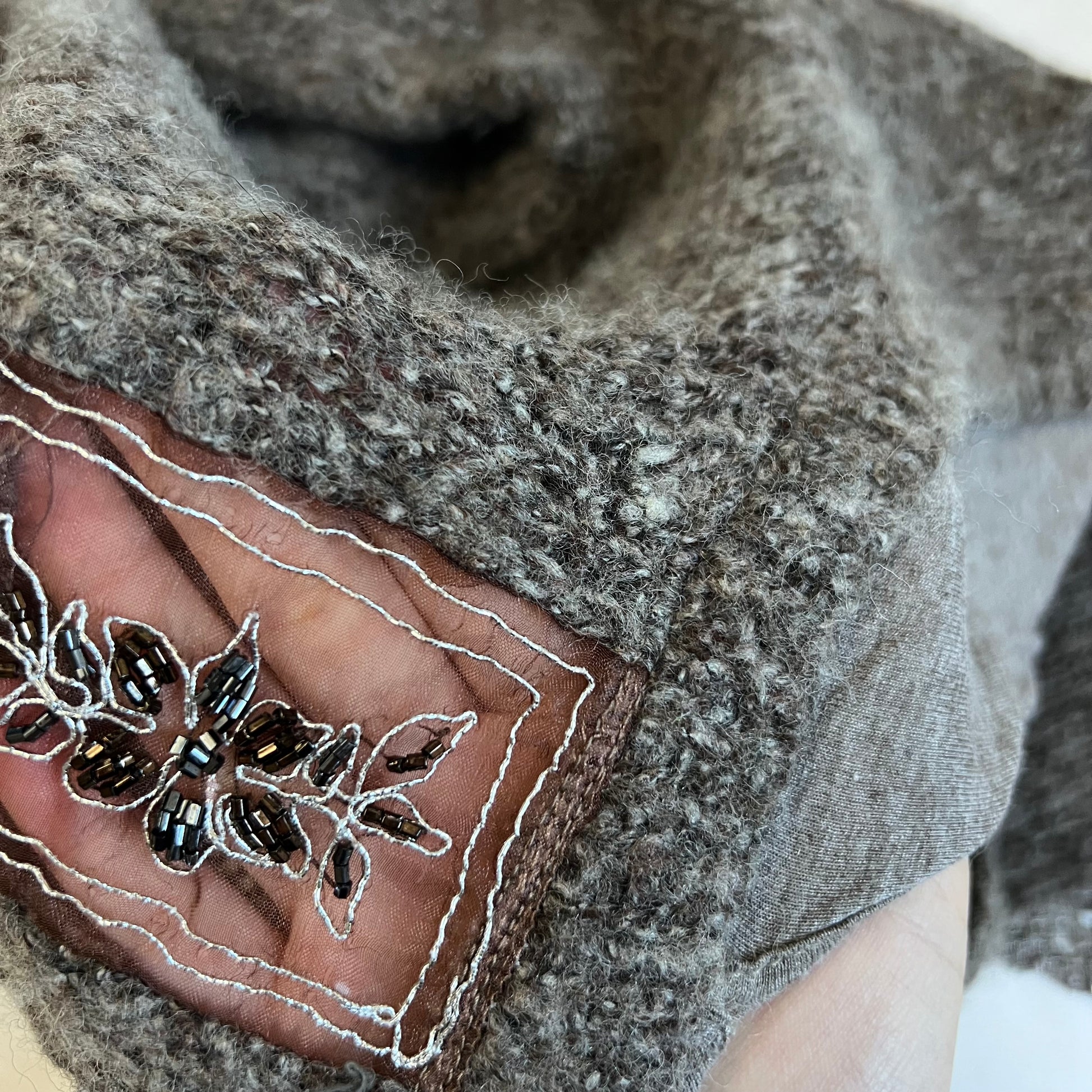 bouche a bouche brown grey long sleeve wool blend layered knit top
