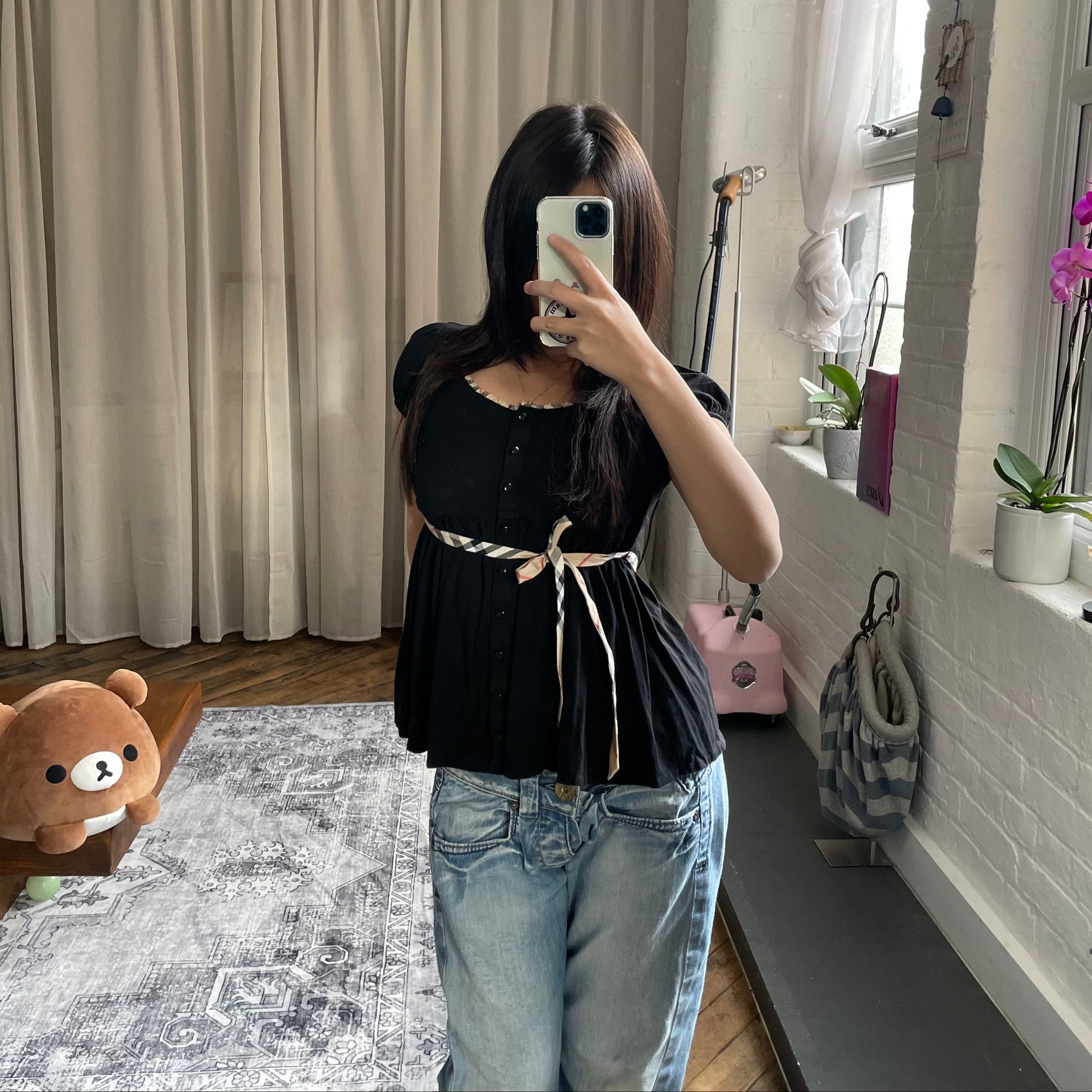 burberry blue label preppy balletcore black puff sleeve babydoll blouson top