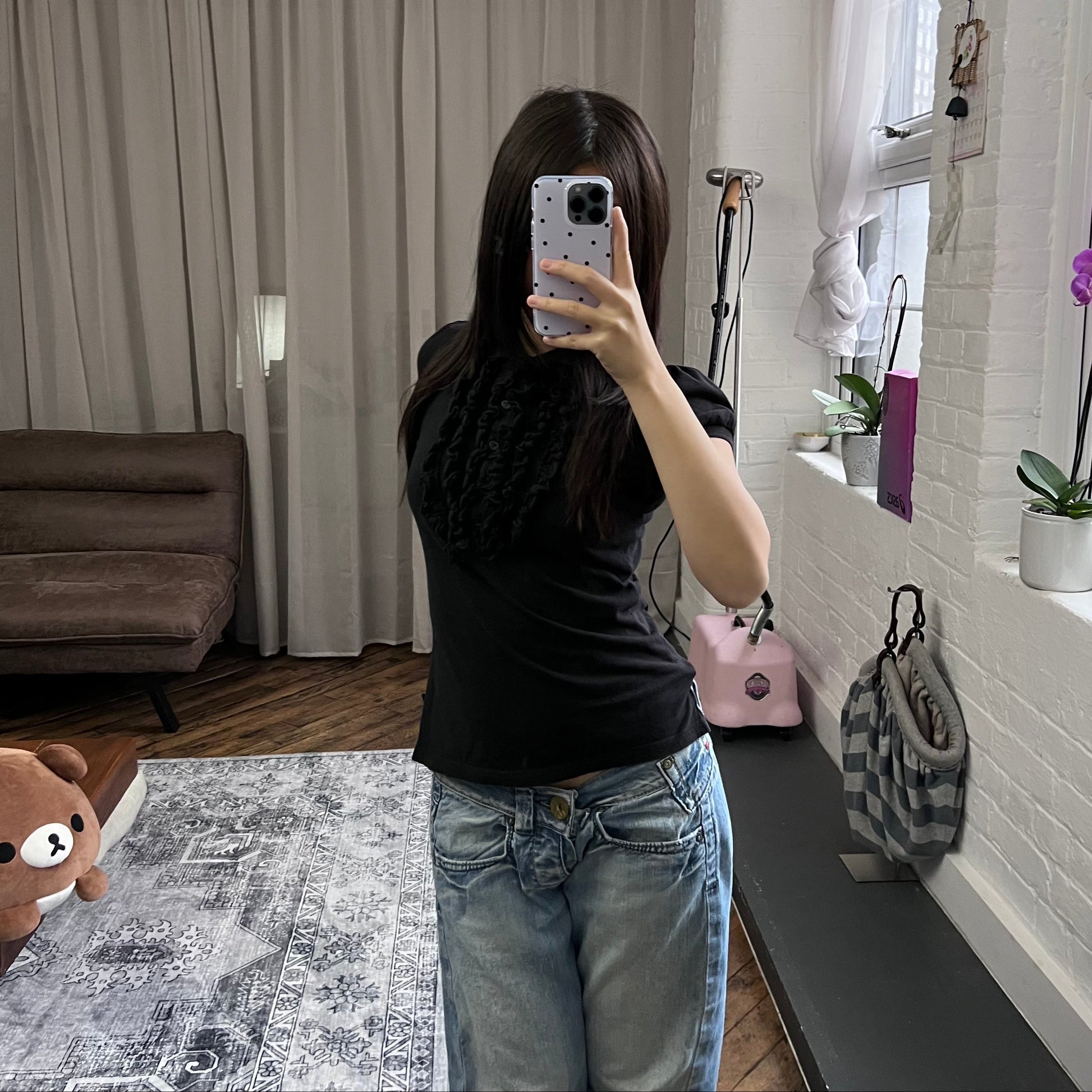 faded black ovs balletcore frilly collared puff sleeve polo shirt