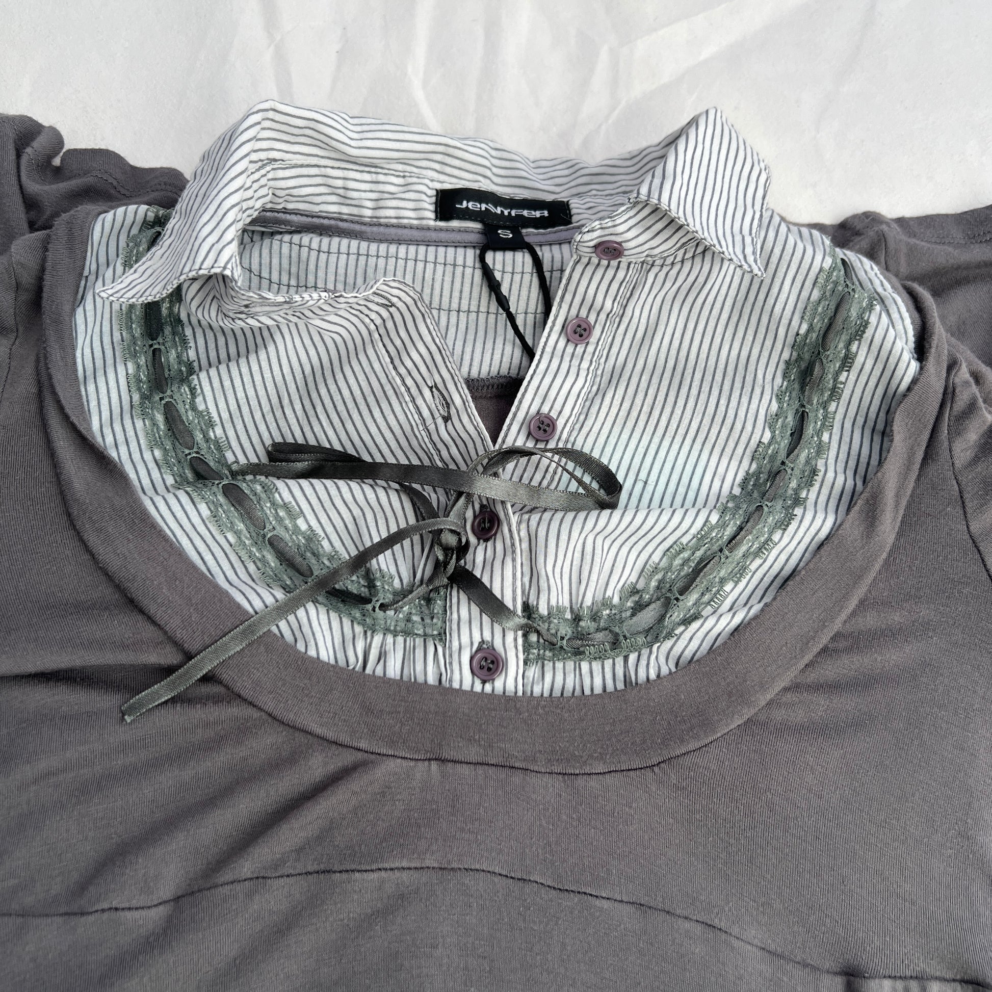 Grey Khaki Jennyfer Milkmaid Striped Lacey Collared Long Sleeve Blouse Two in One Dress