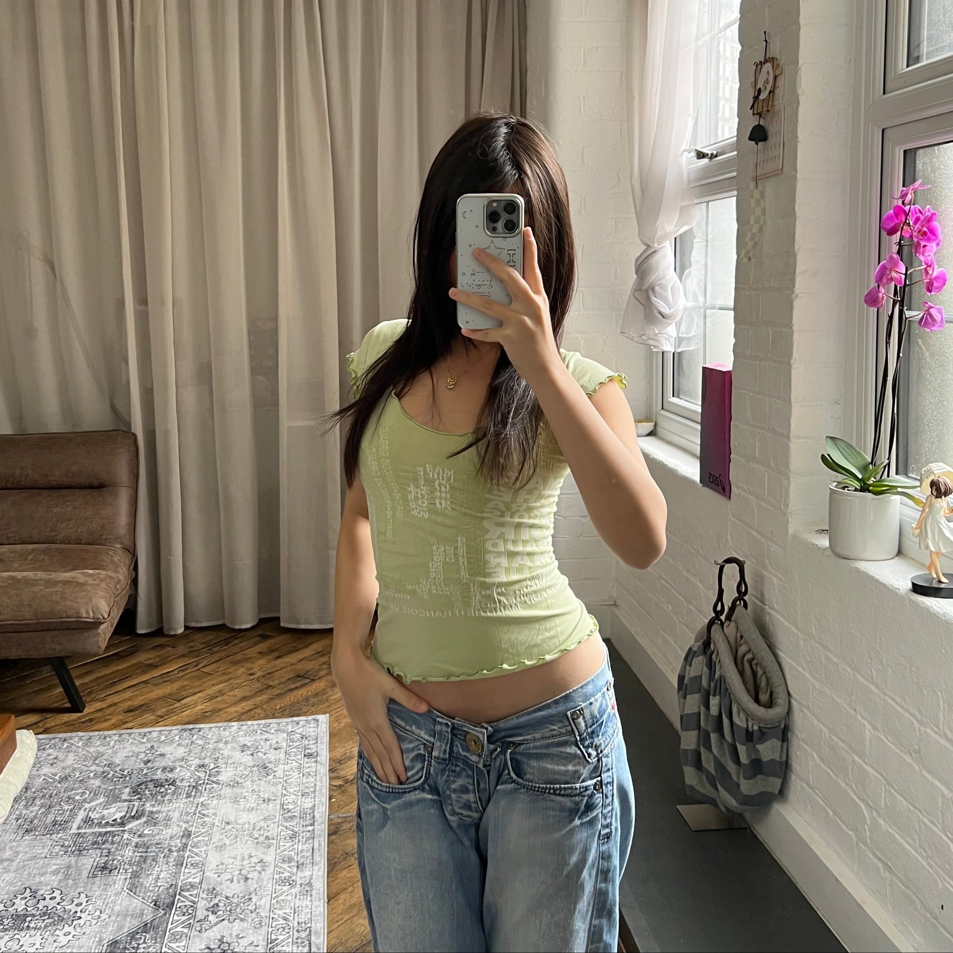 light spring green marithe francois girbaud text graphic fitted short sleeve top