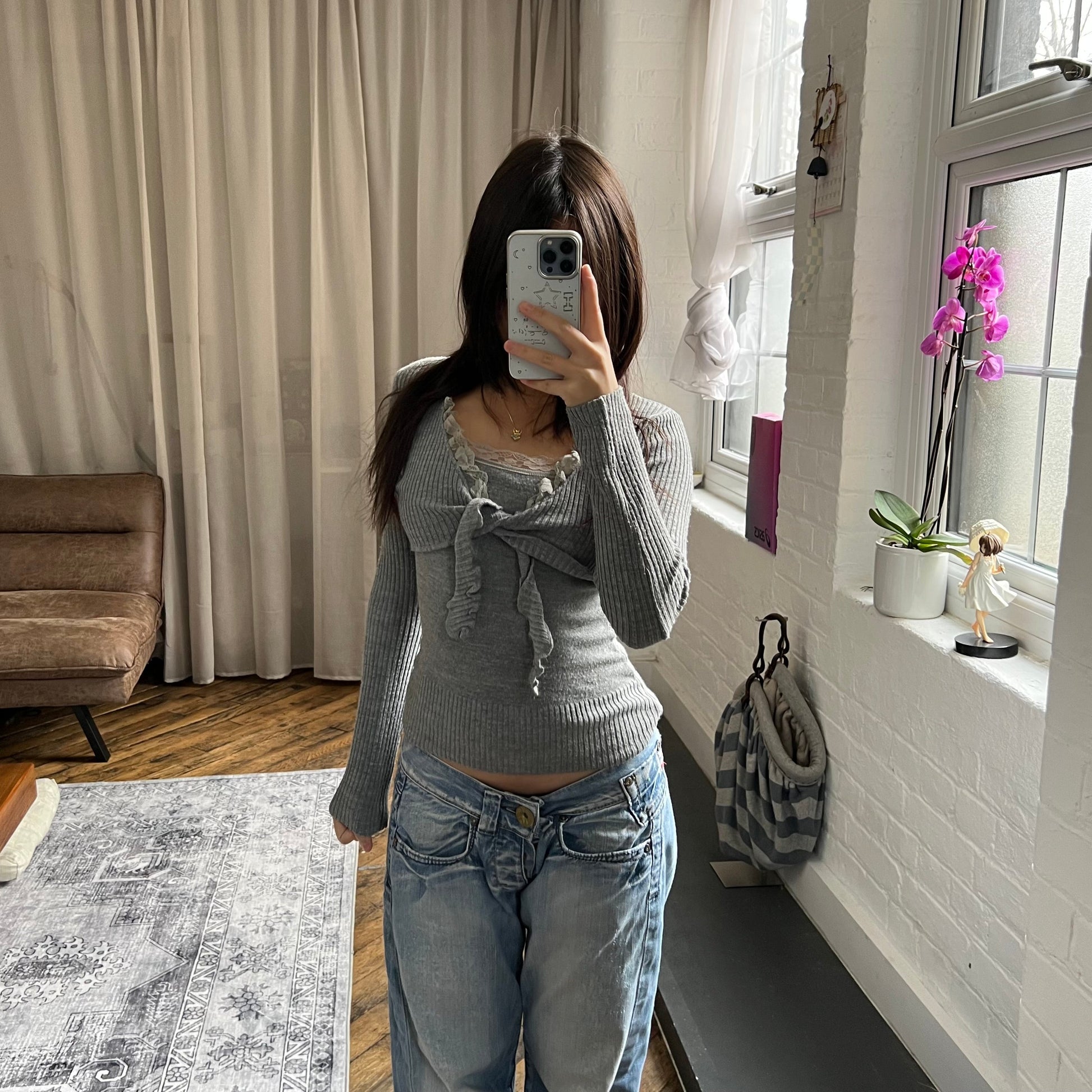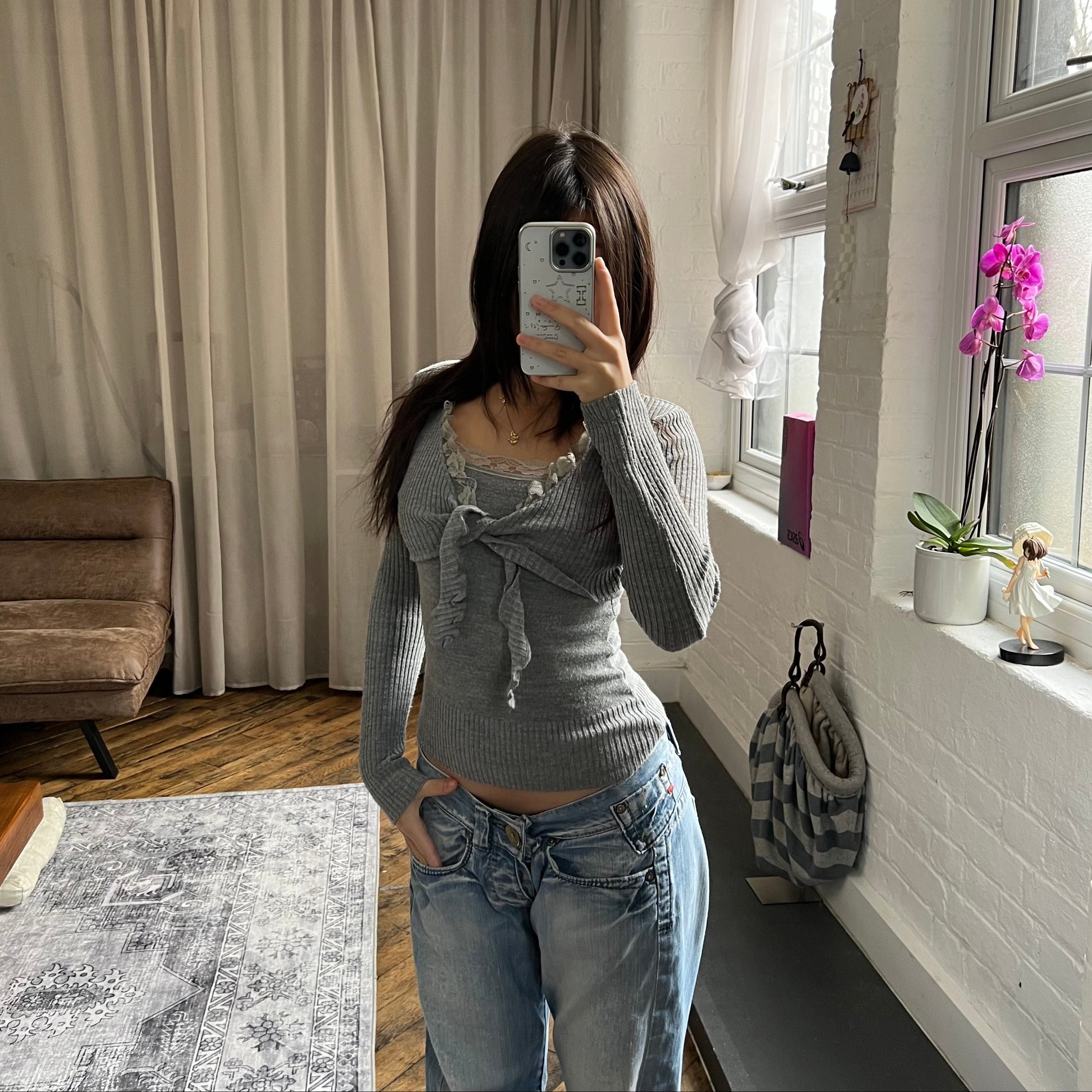 lilu mecredi frilly grey lace trim long sleeve knit bolero and cami two in one layered top