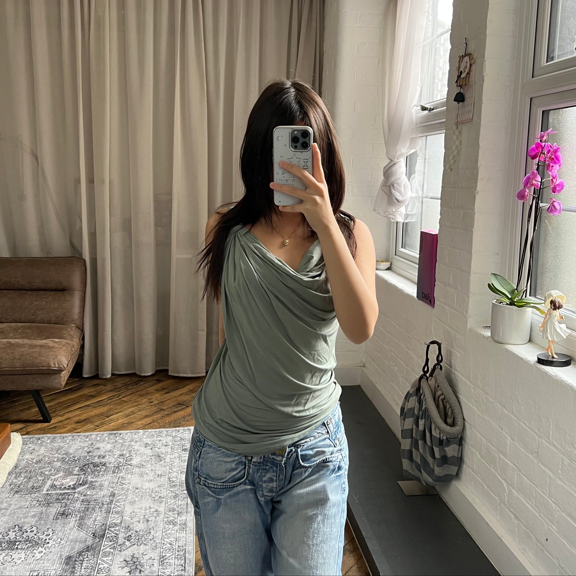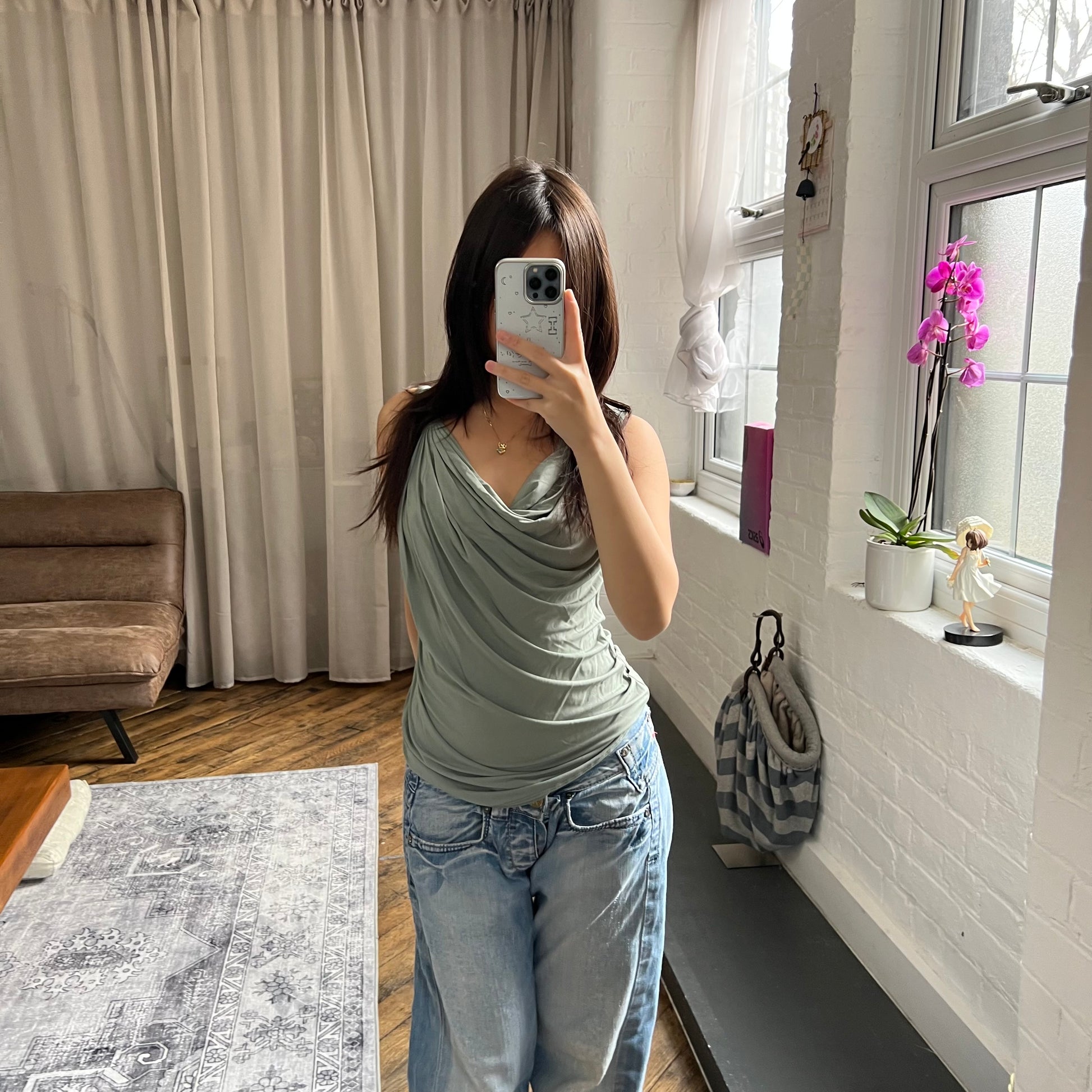 malloni sage green draped nylon ruched side sleeveless tunic vest