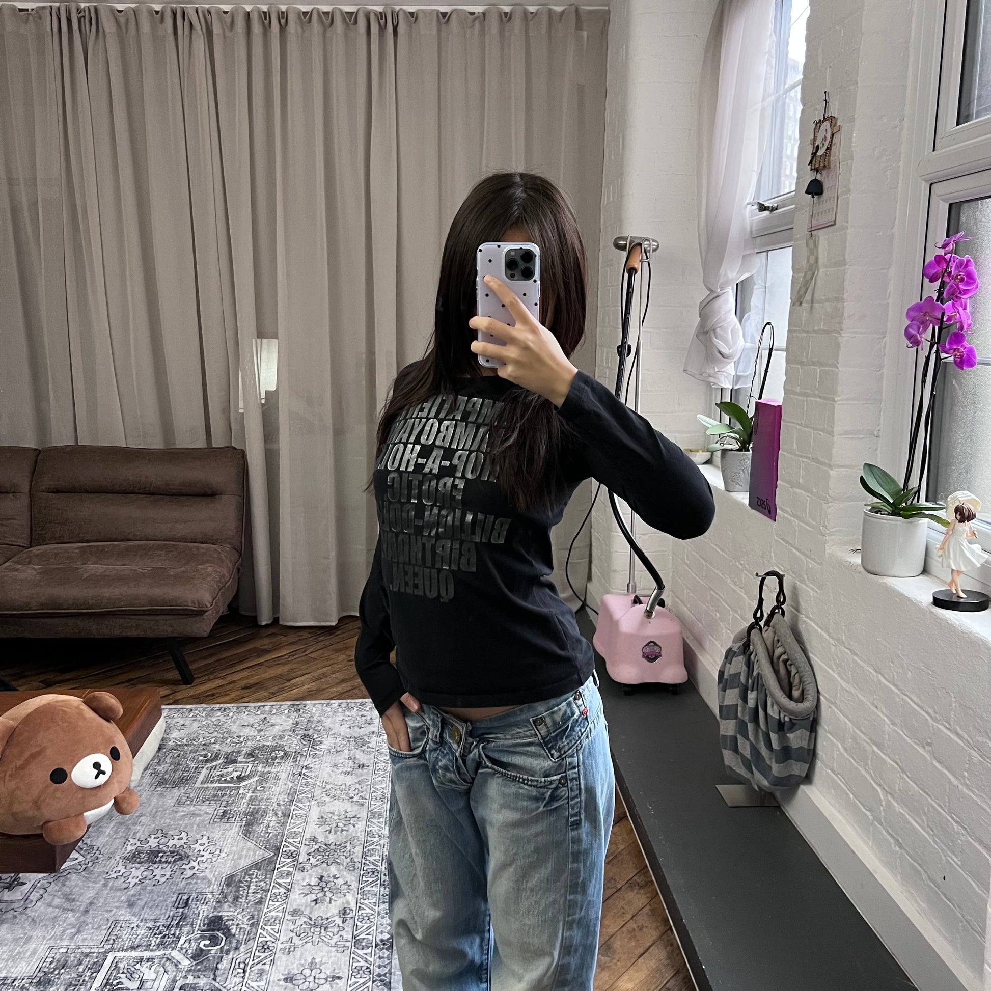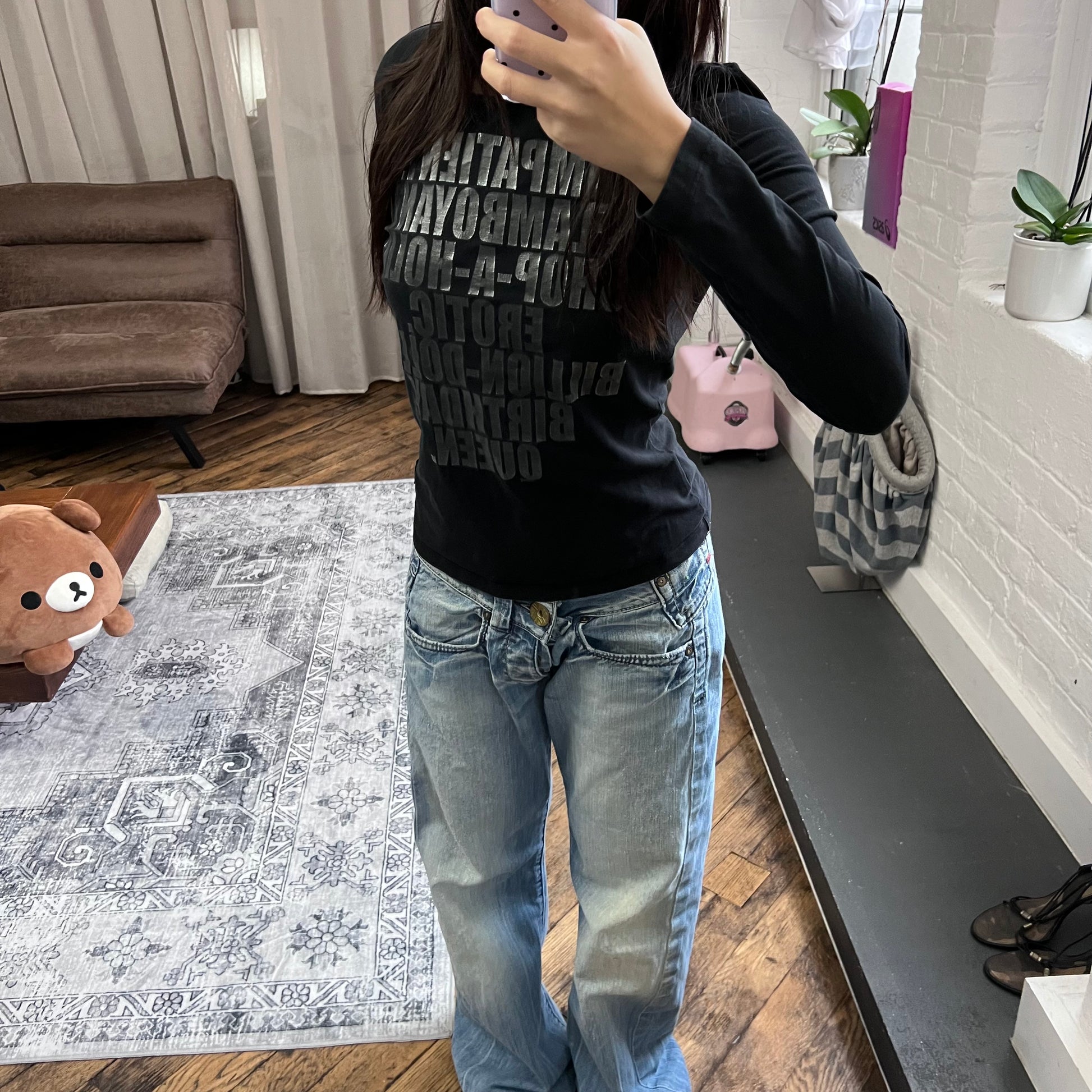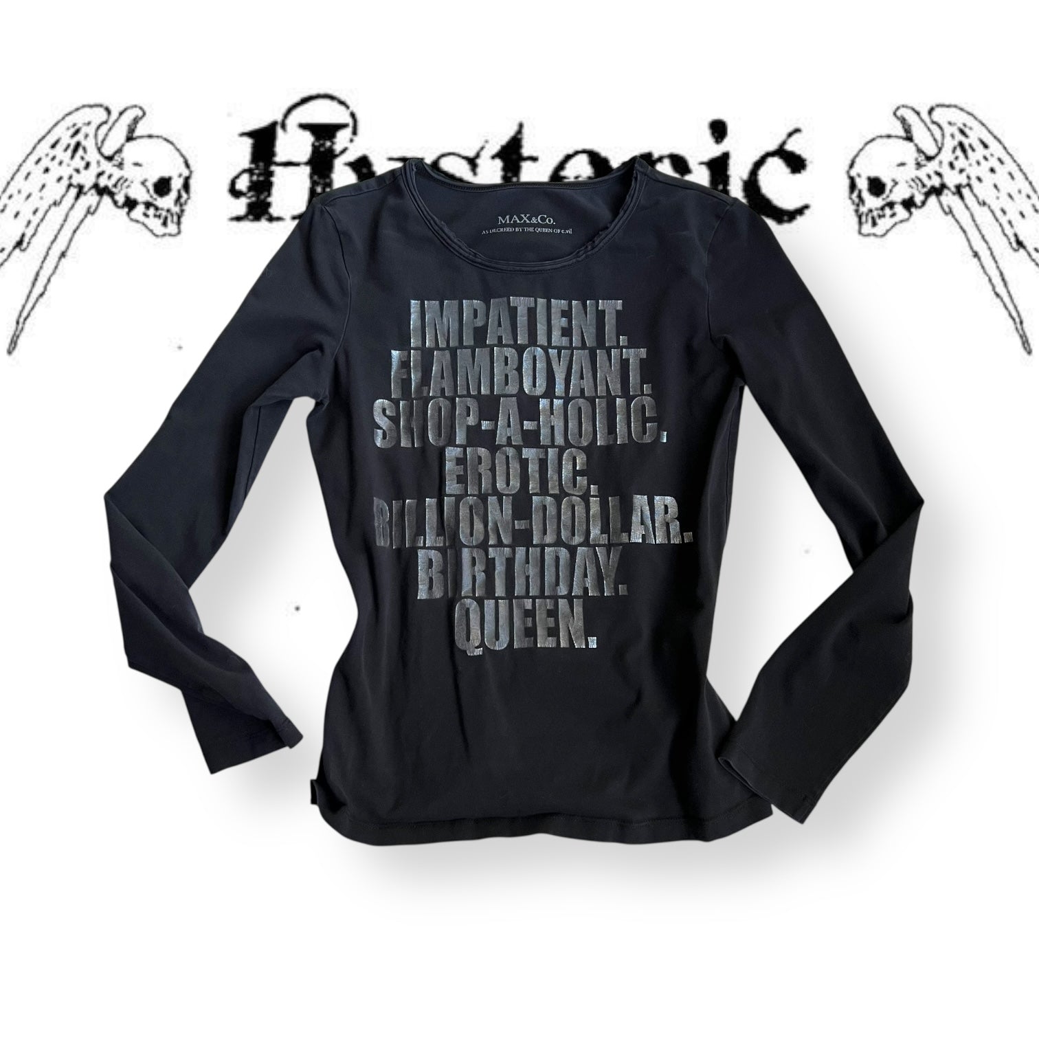 max & co vintage long sleeve dark grey graphite metallic text fitted shirt