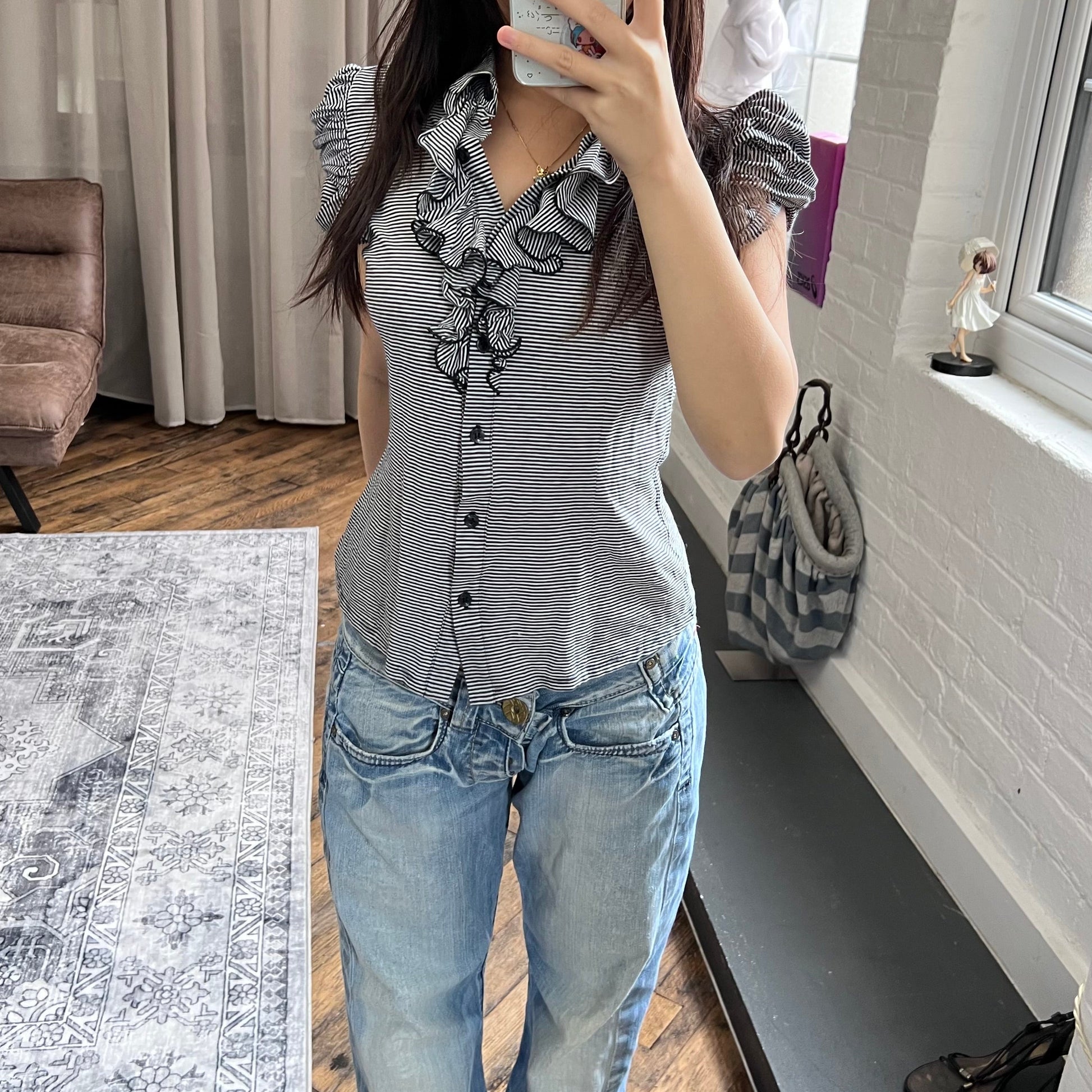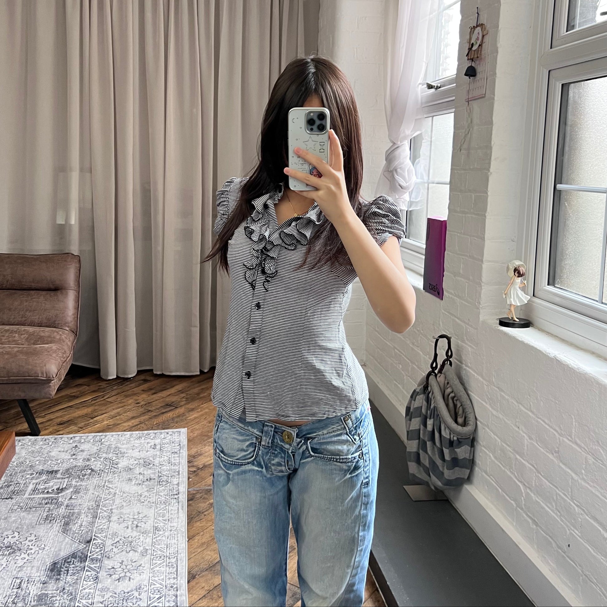 naracamicie black academia preppy ruffle striped puff sleeve collared polo style shirt