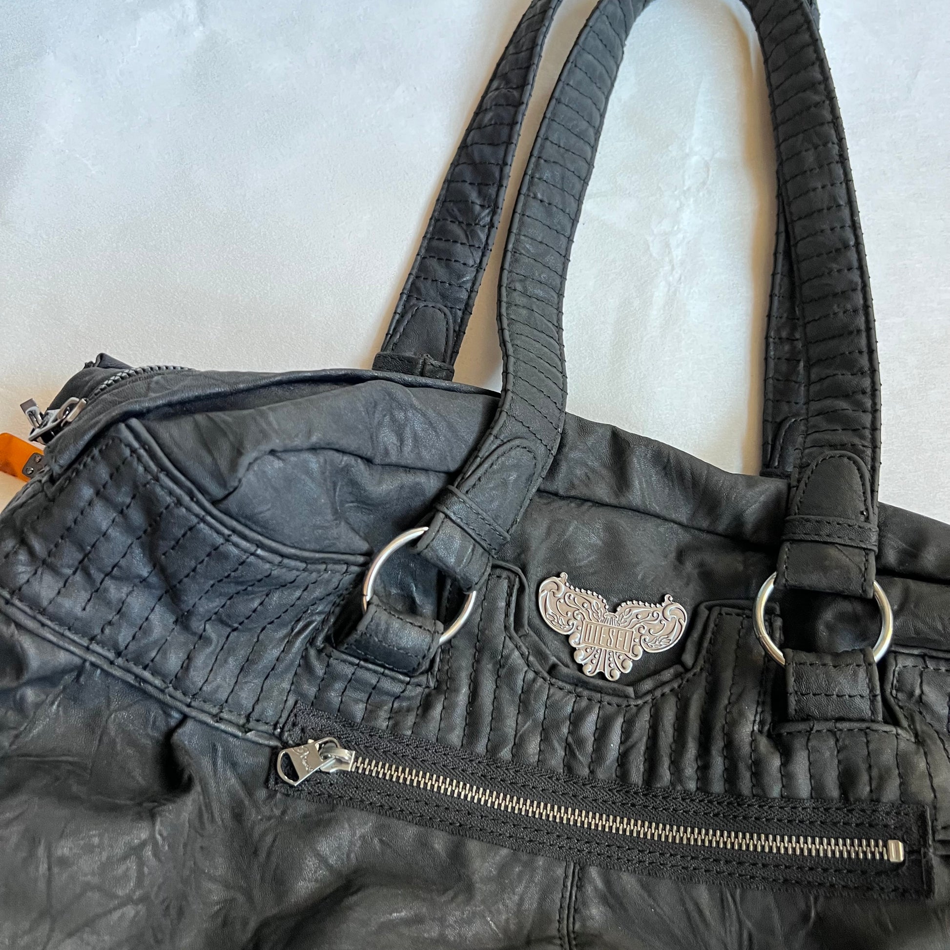vintage diesel black leather silver wing emblem tote bag