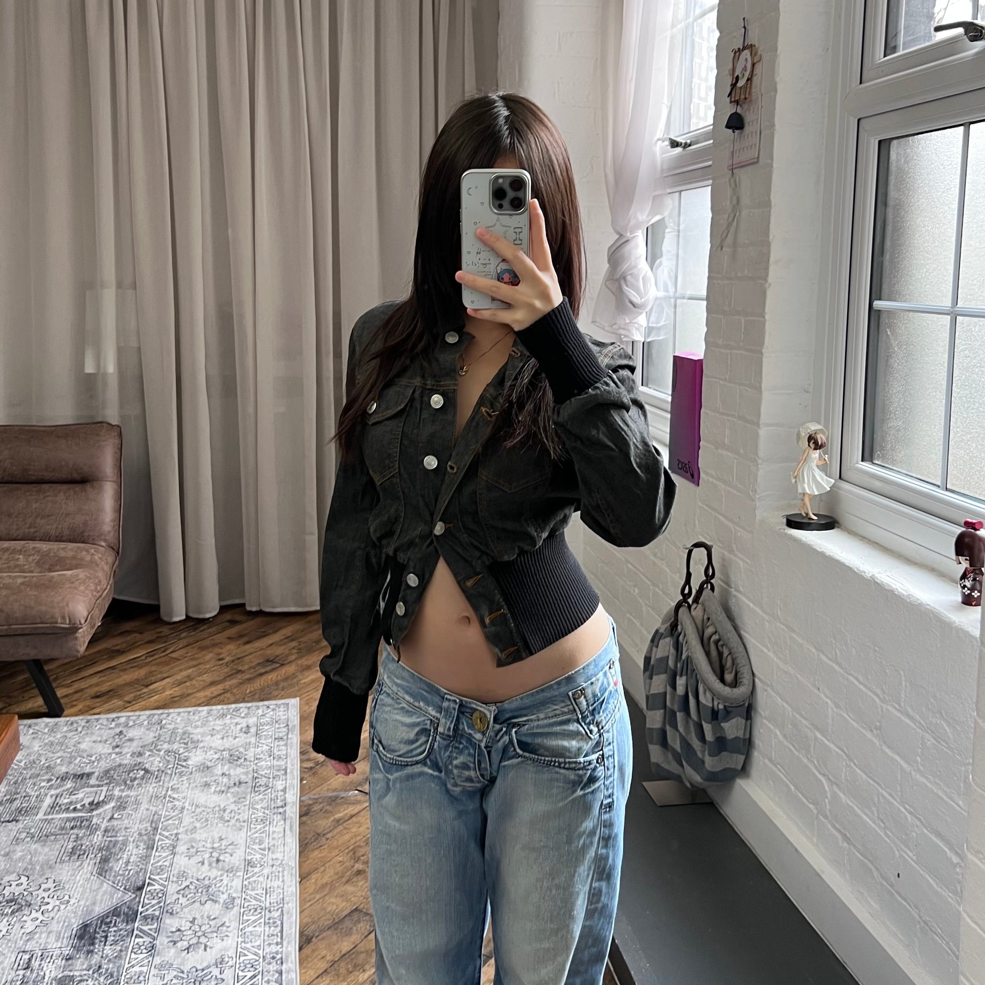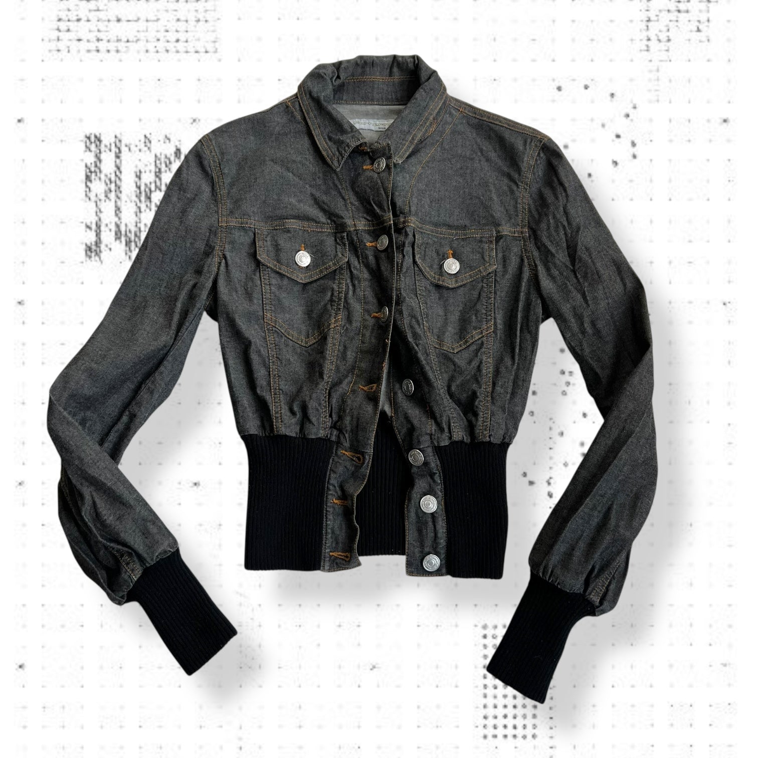 vintage fornarina dark indigo wash denim long sleeve cinched ribbed waist collared jacket