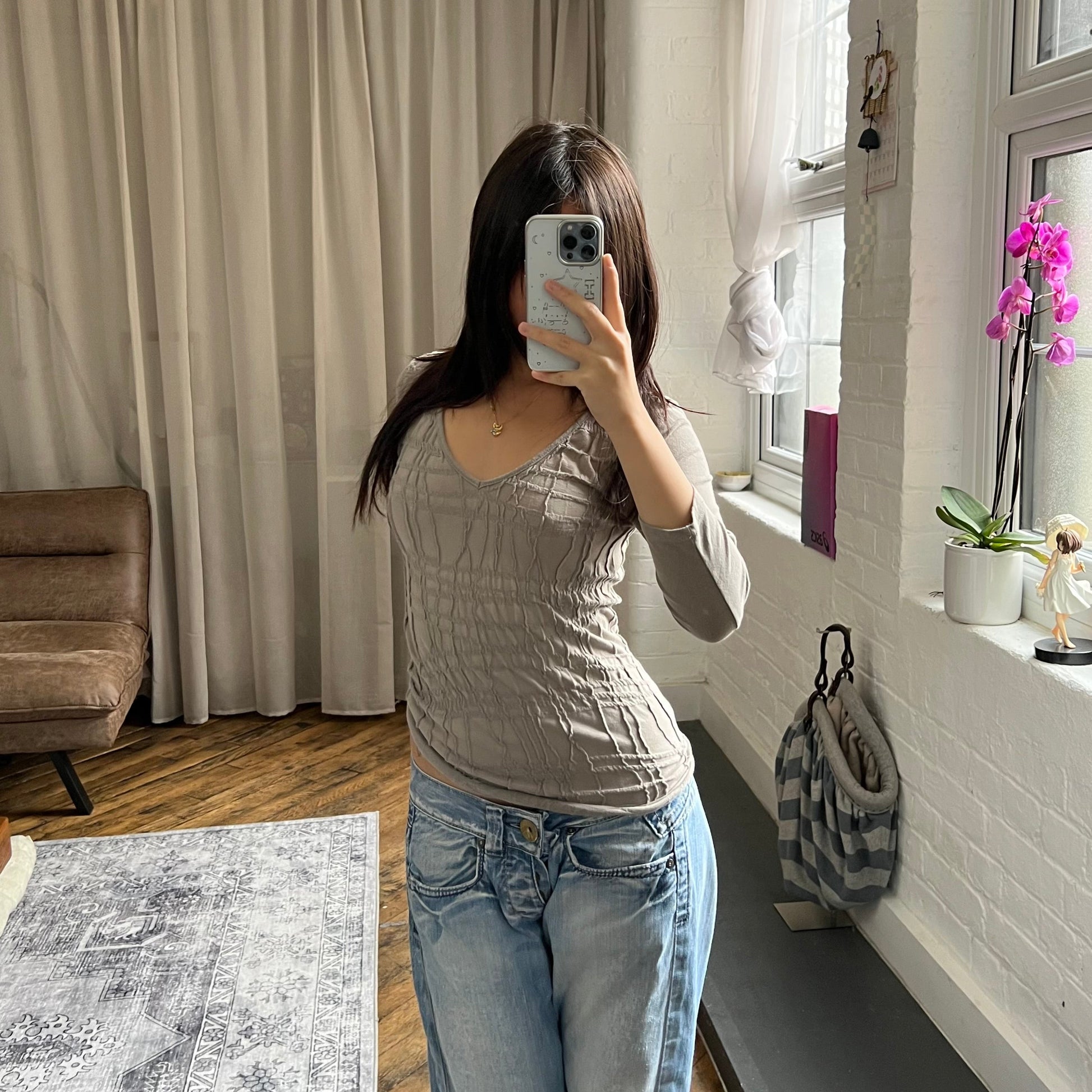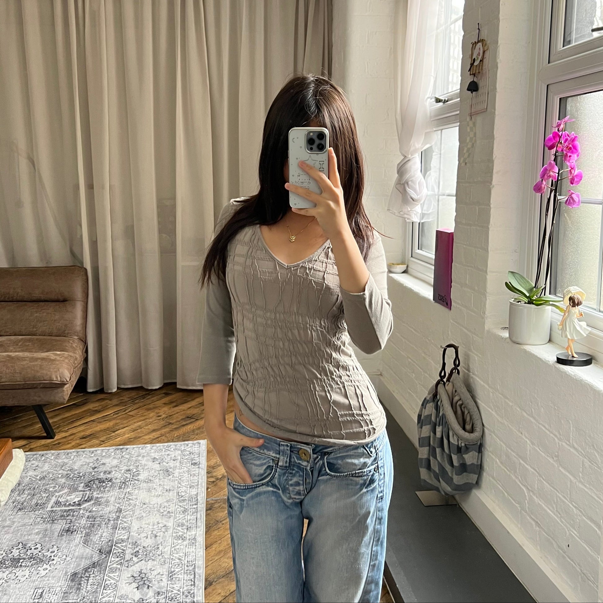 beige sarah pacini ruched 3/4 sleeve fitted top