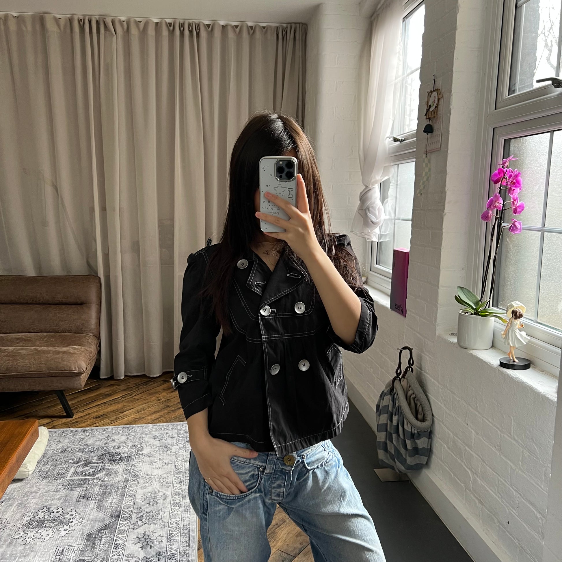 black 3/4 sleeve 3suisses corpcore crop silver button collared trench coat jacket