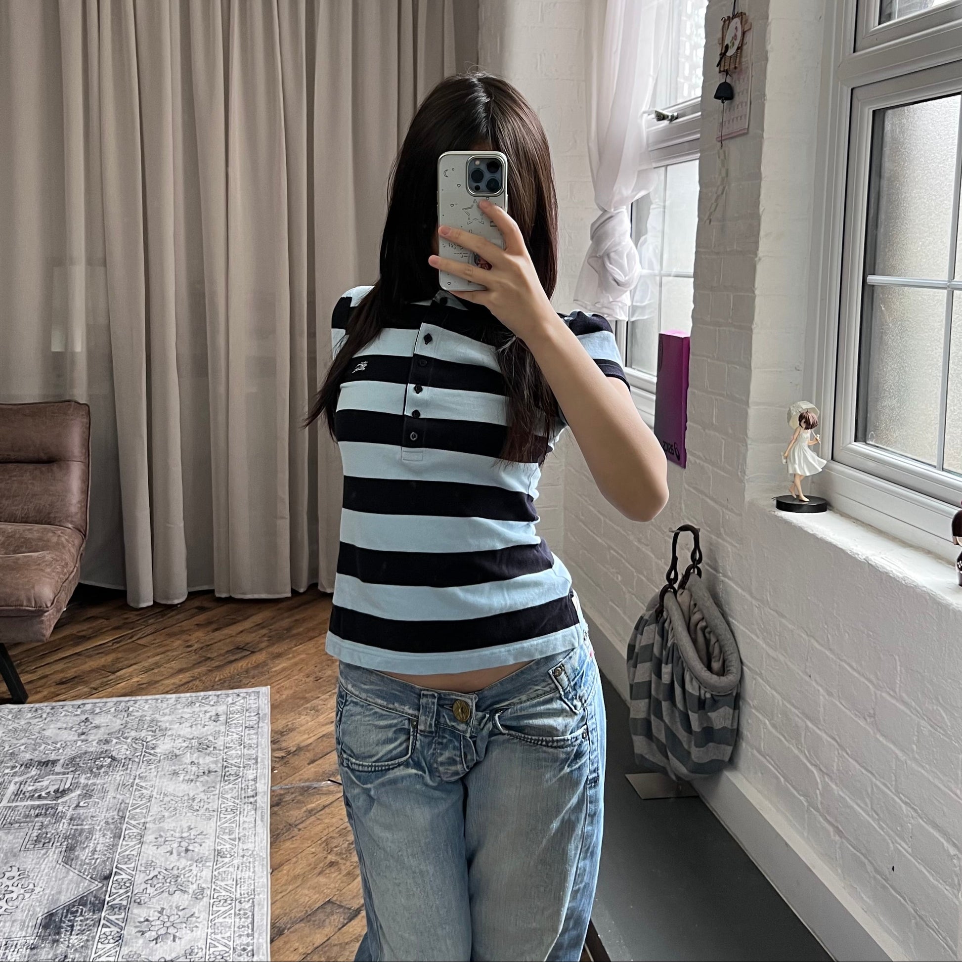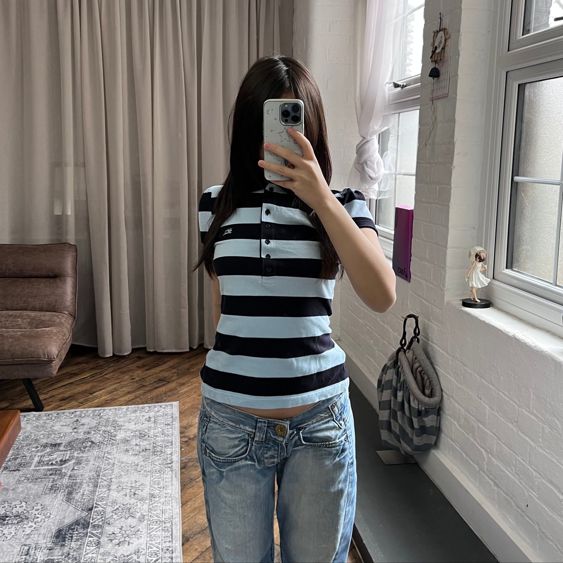 burberry blue label preppy black baby blue striped puff sleeve collared polo shirt