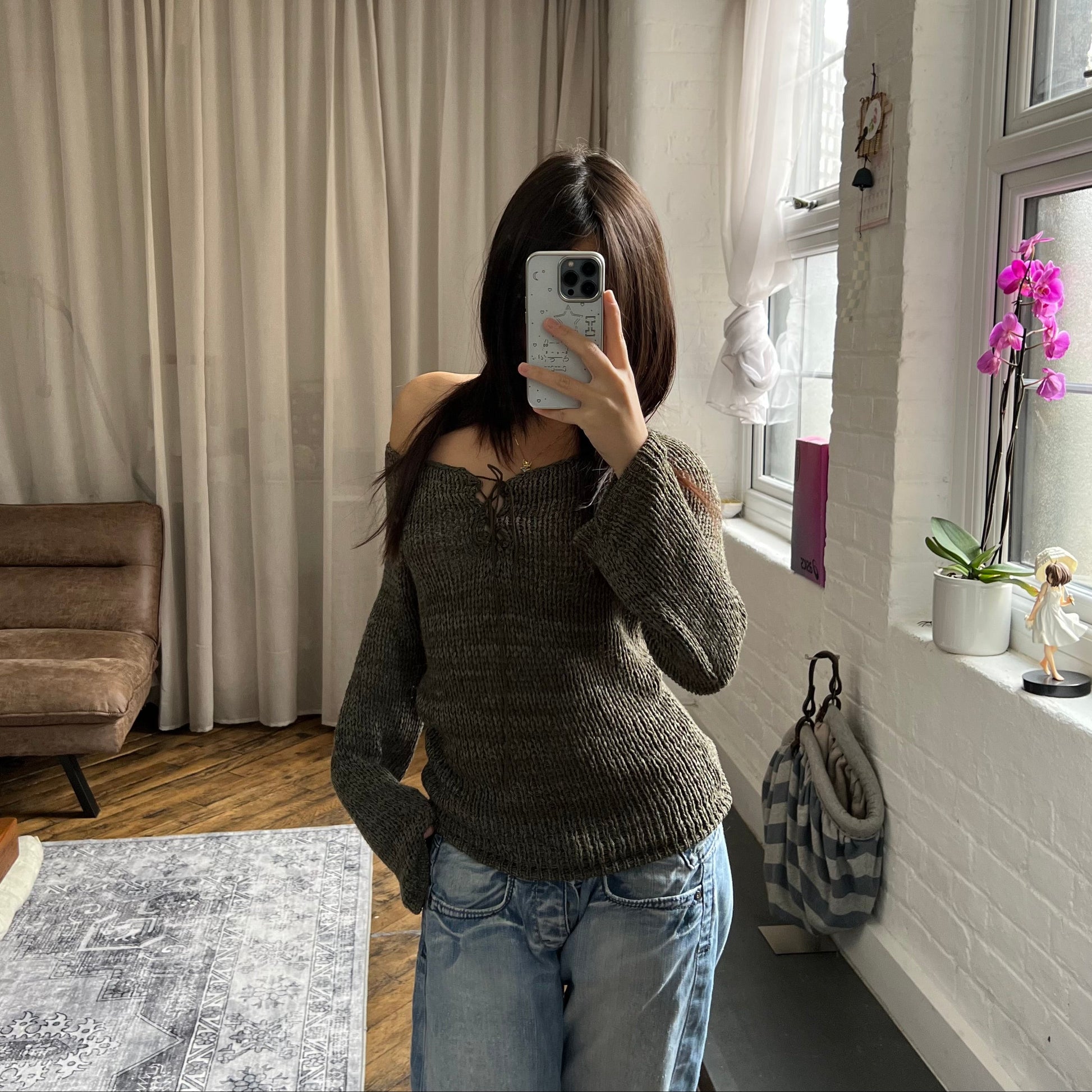 camieux khaki green flared sleeve lace up knit sweater