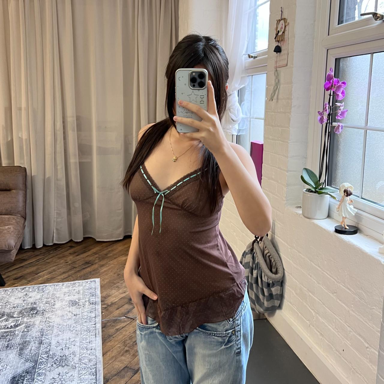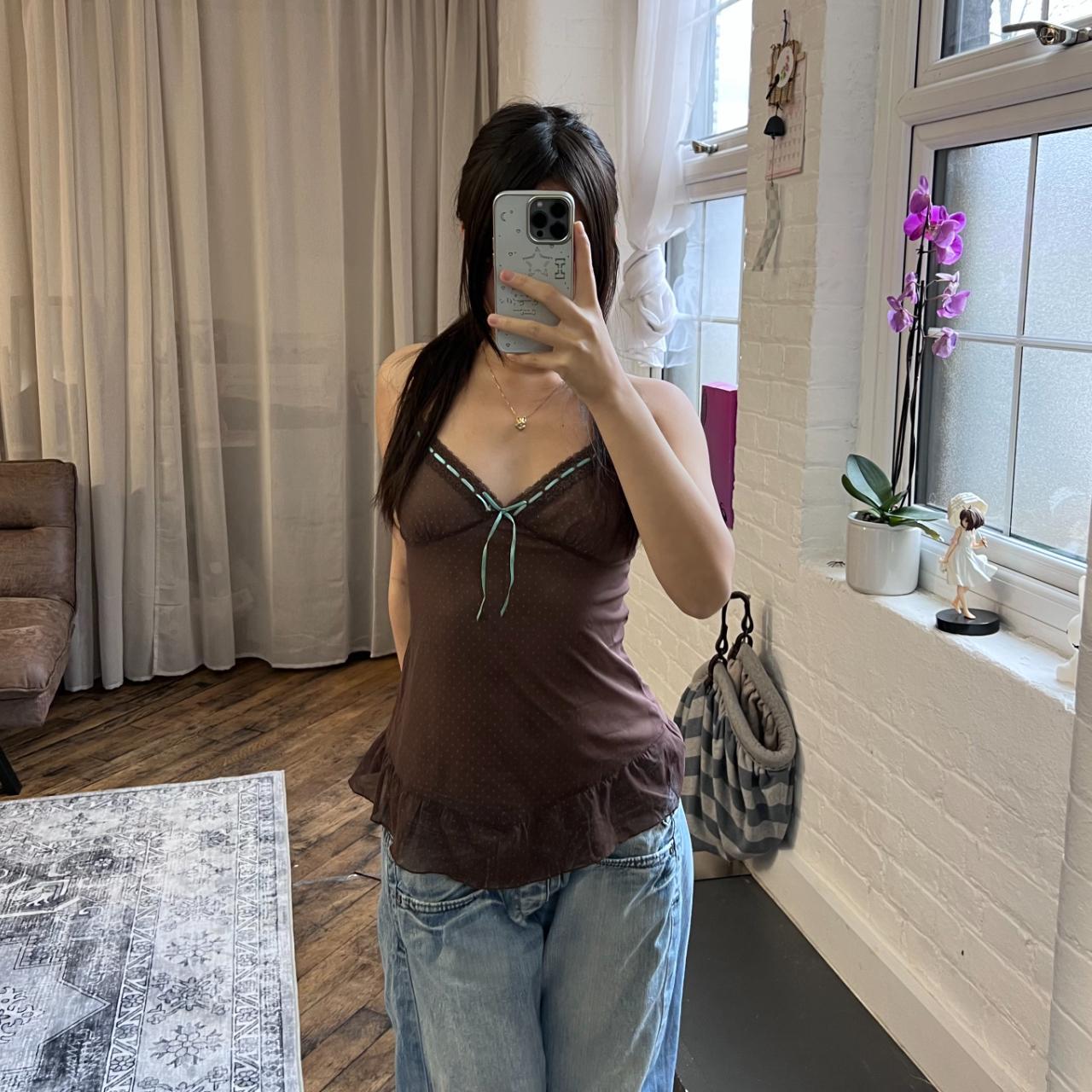 coquette preppy vintage rampage brown polka dot print sheer camisole with blue satin ribbon detail
