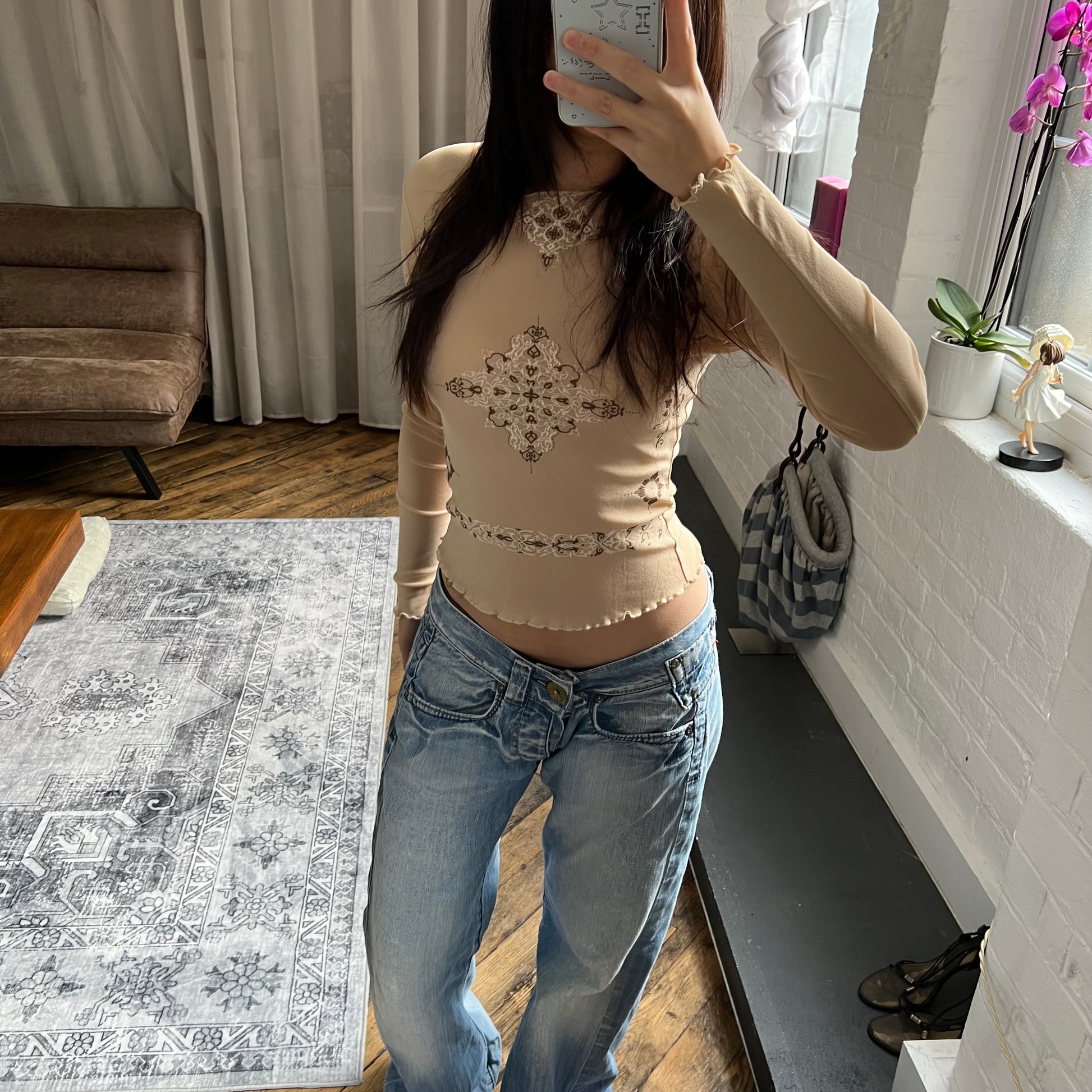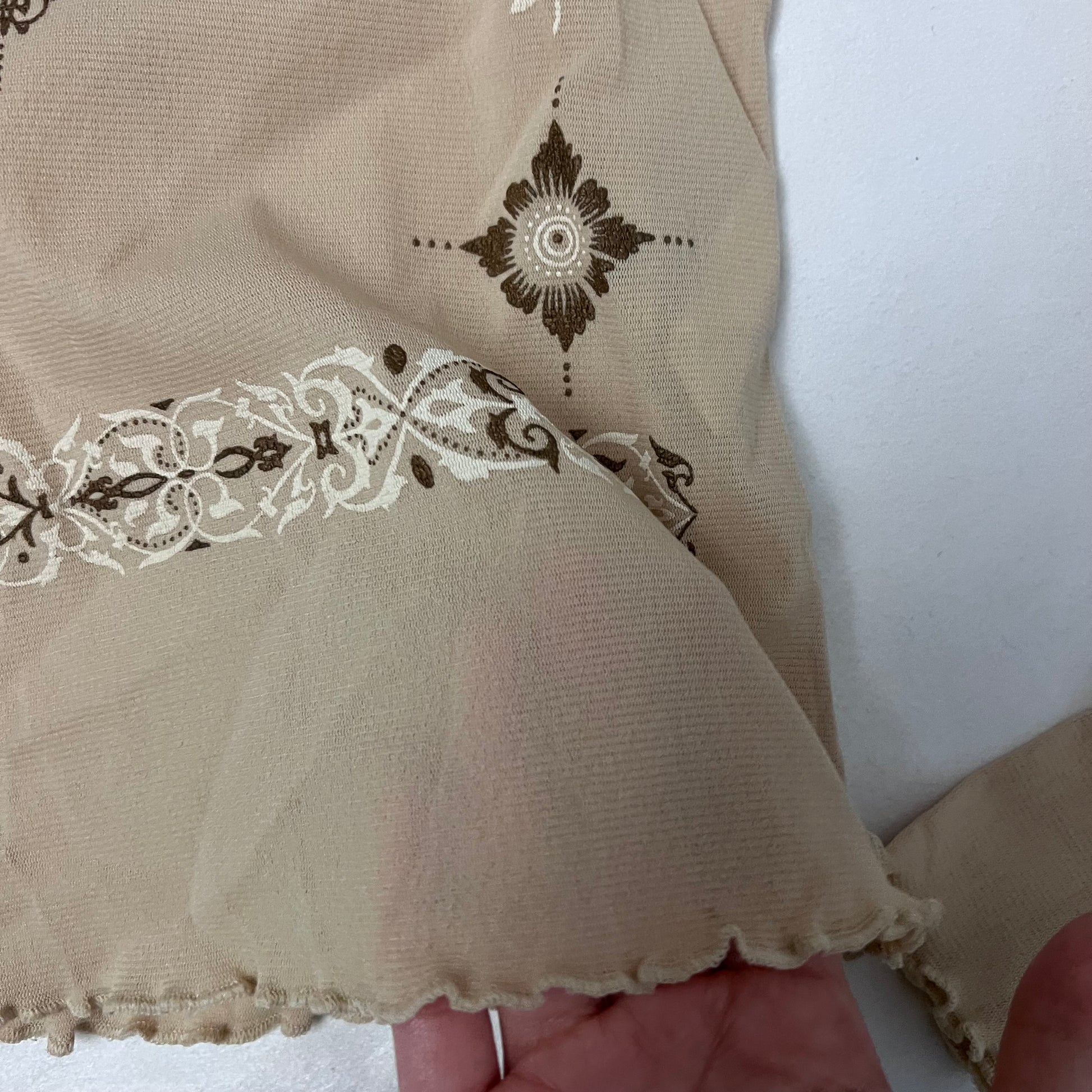jacobson boho western beige sheer paisley ornamental print sheer long sleeve shirt