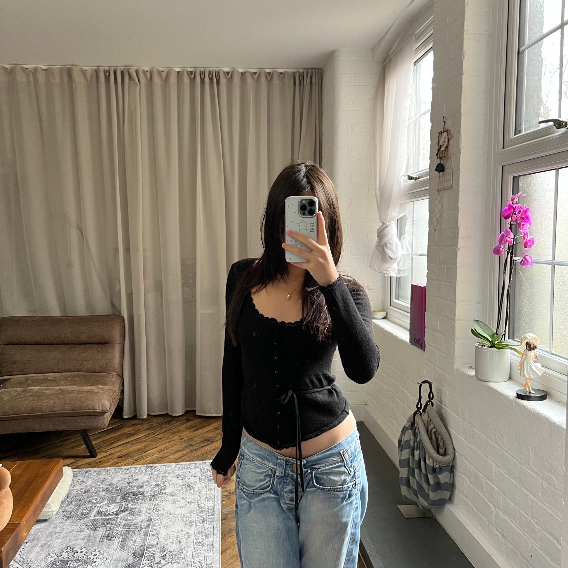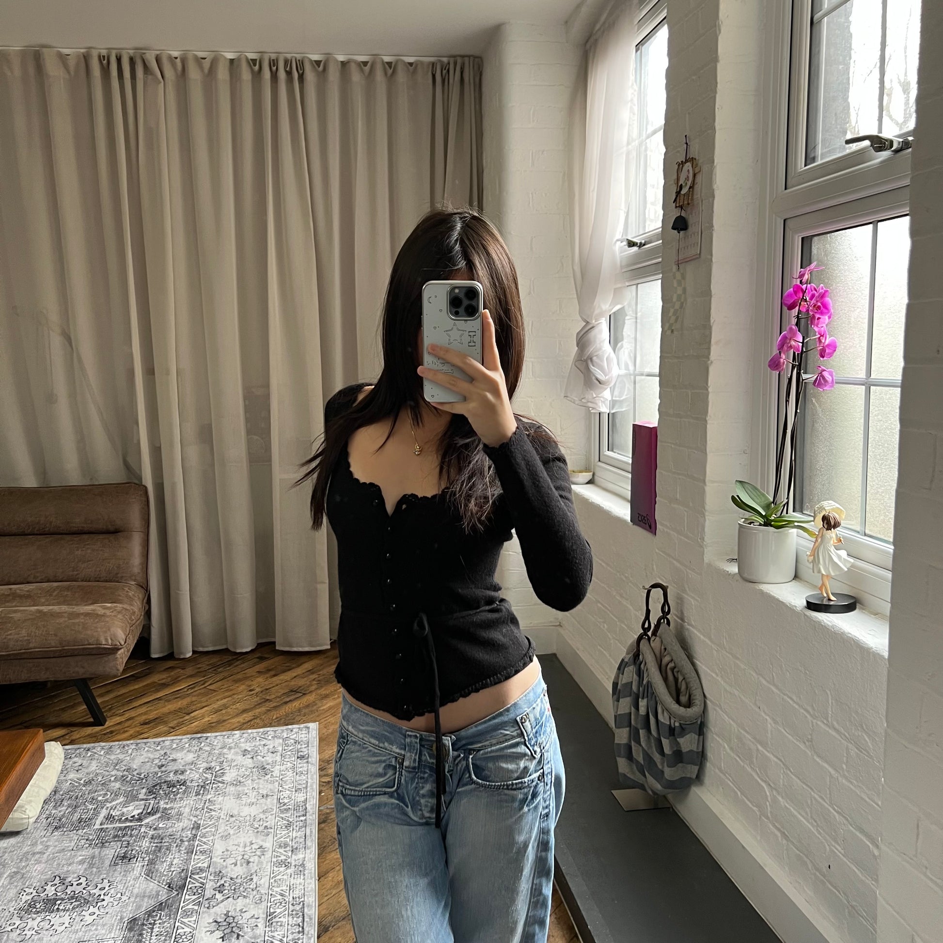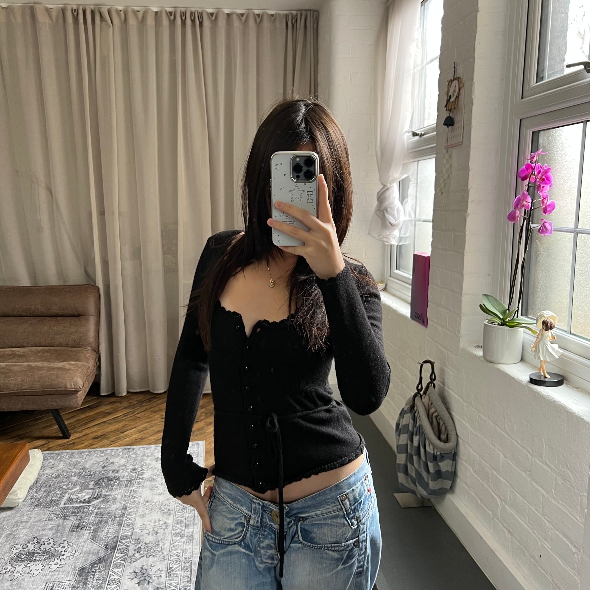 kookai black wool blend picot trim long sleeve fitted cardigan top