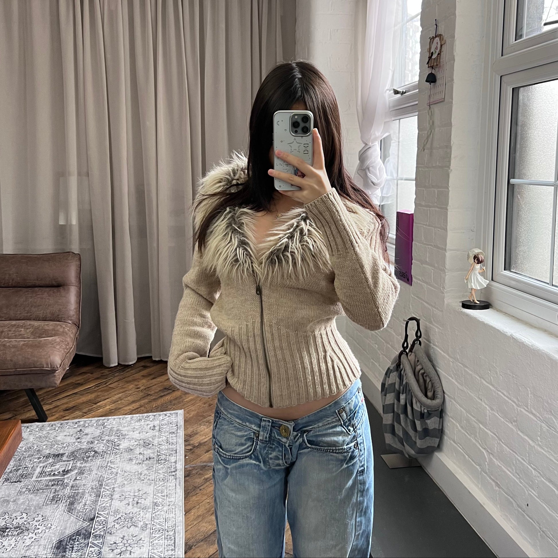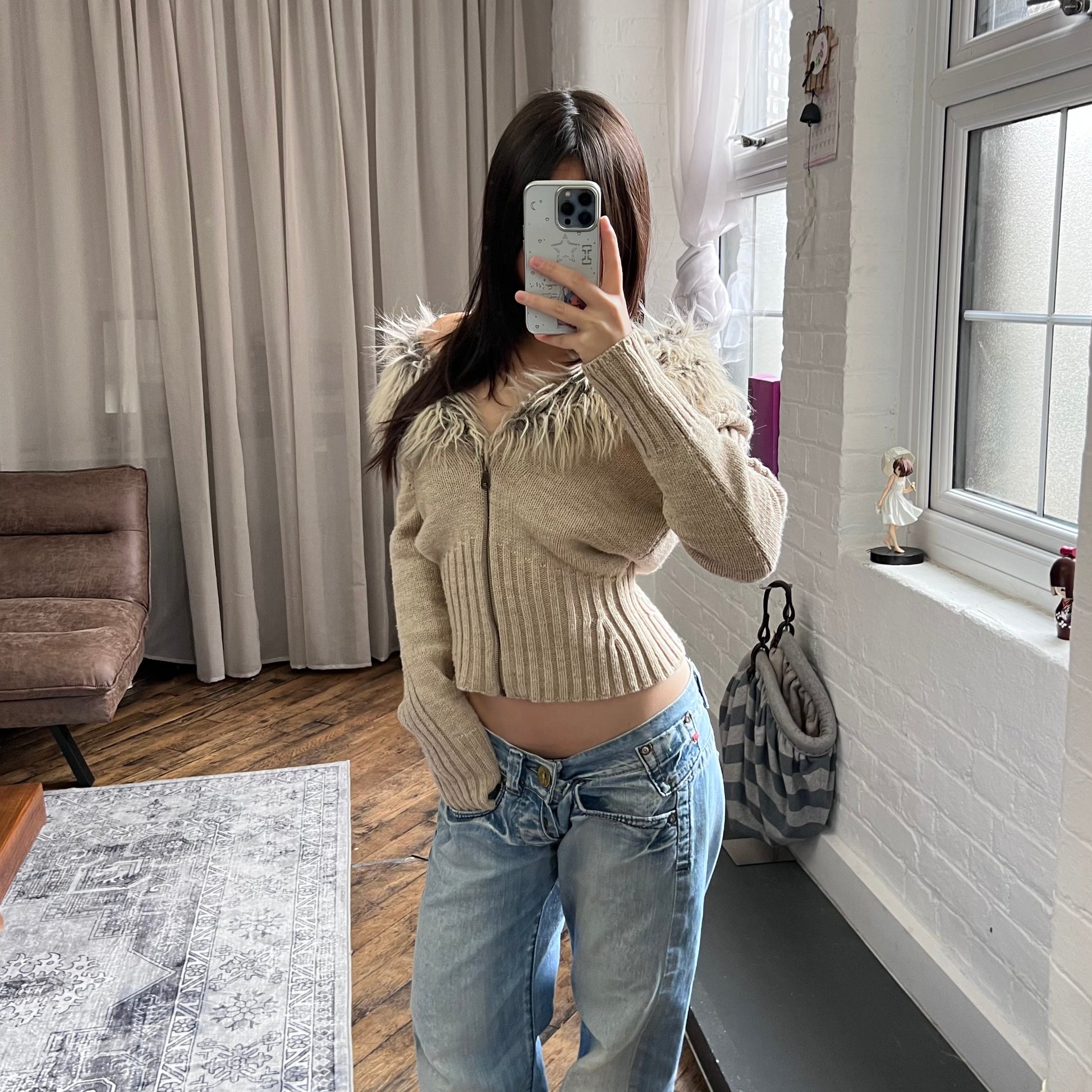 morgan de toi beige fur collar wool blend knit zip cardigan jacet