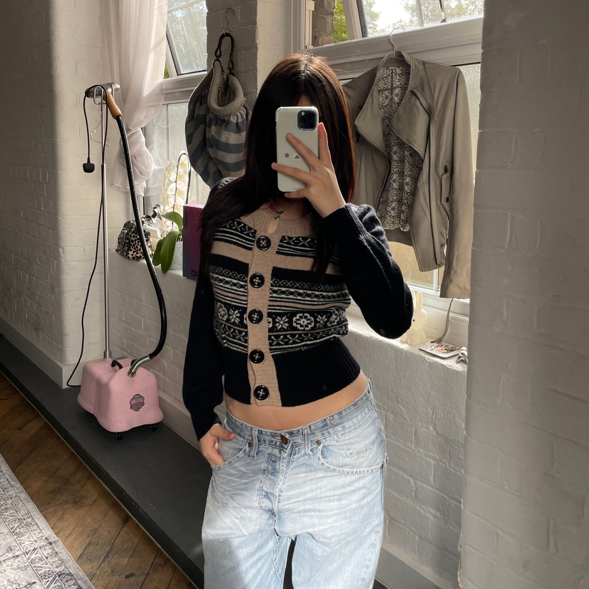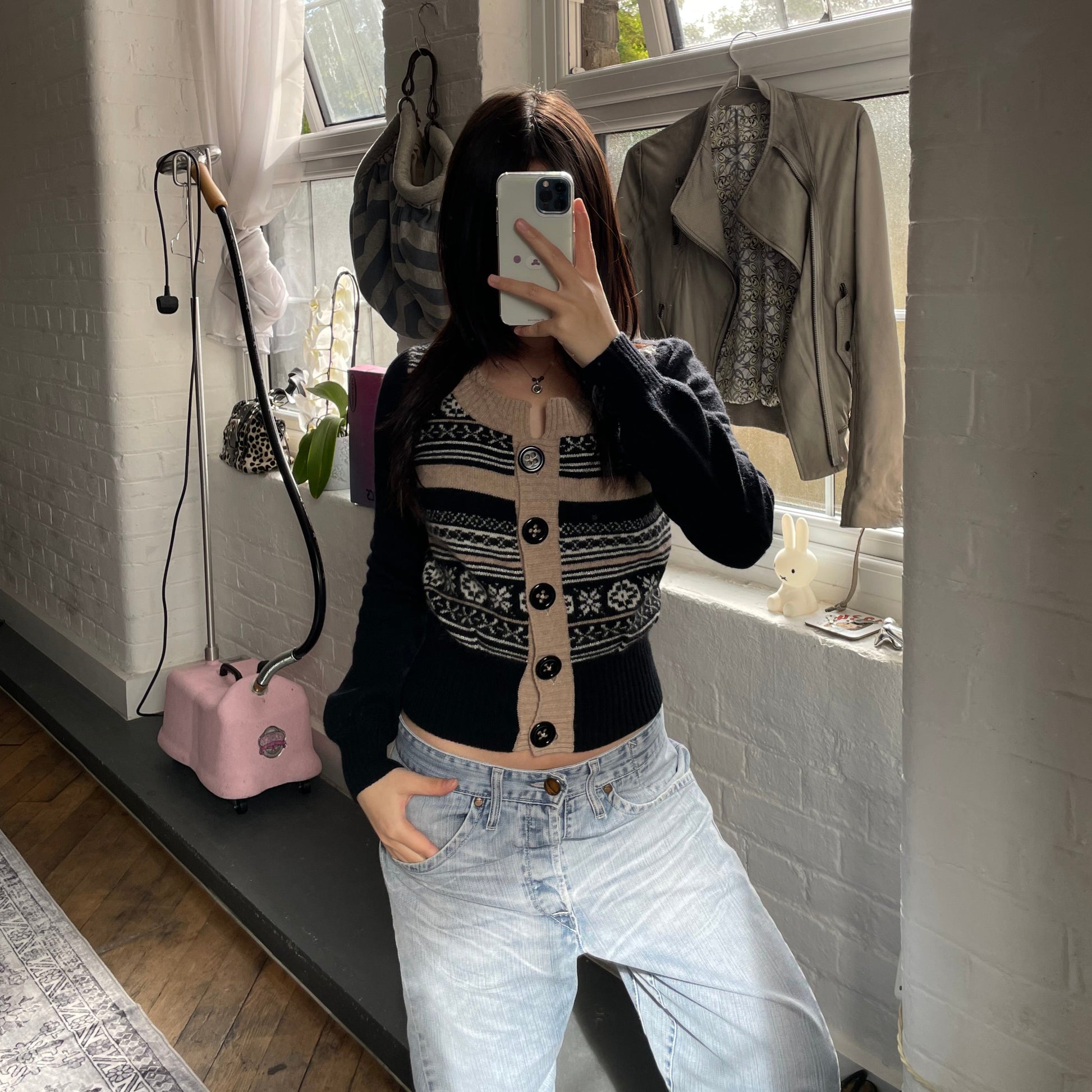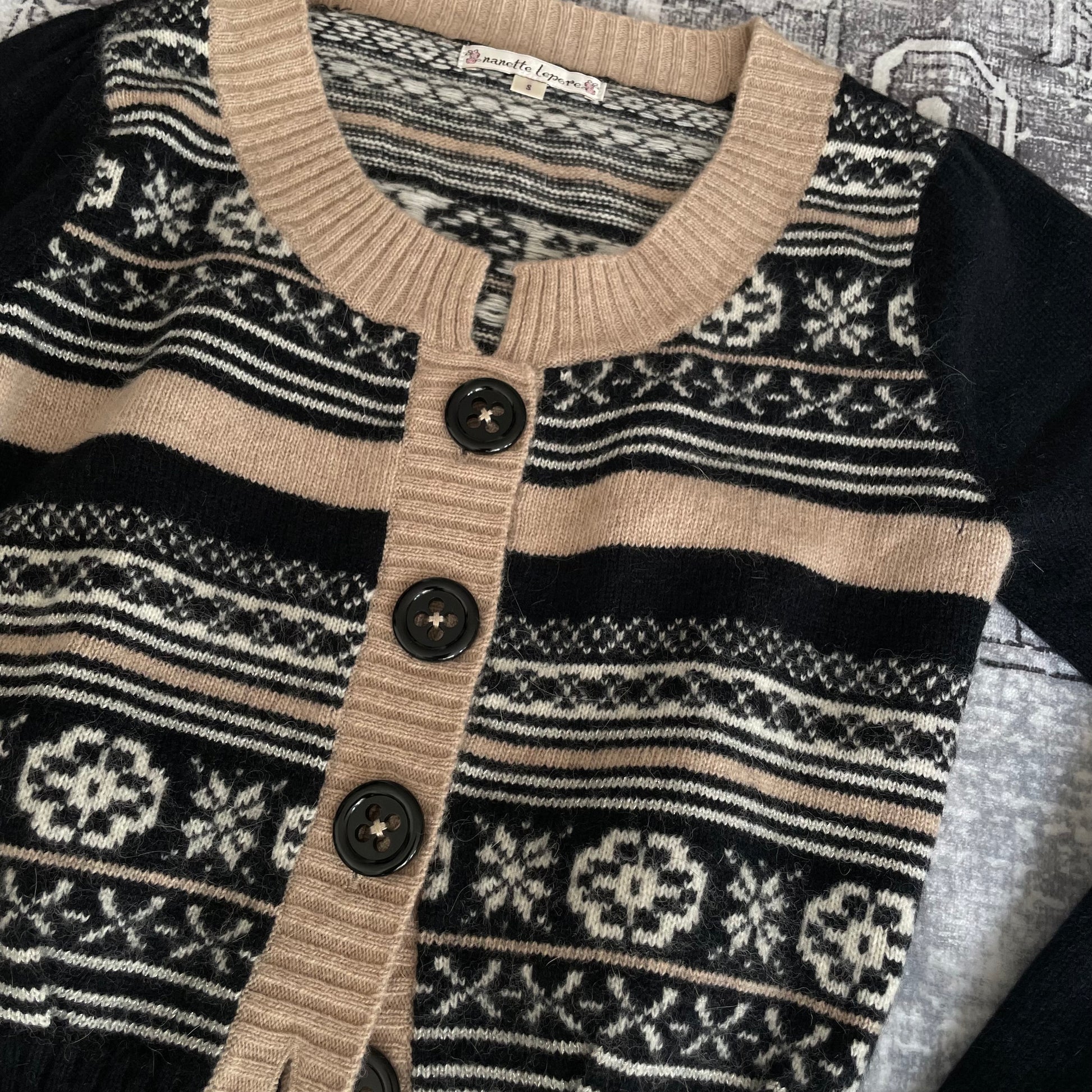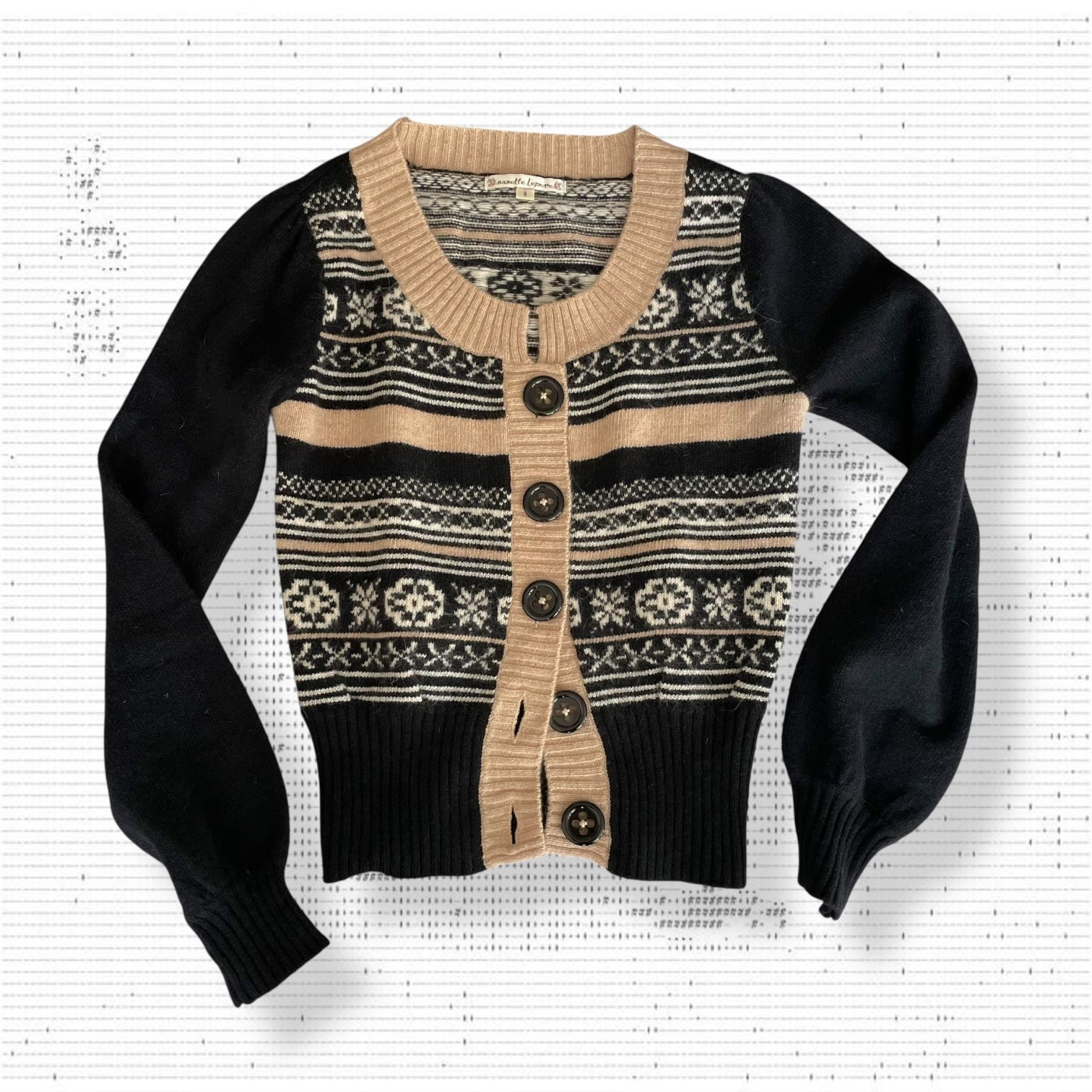 Nanette Lepore 安哥拉混纺黑色米色冬季雪花印花短款开衫