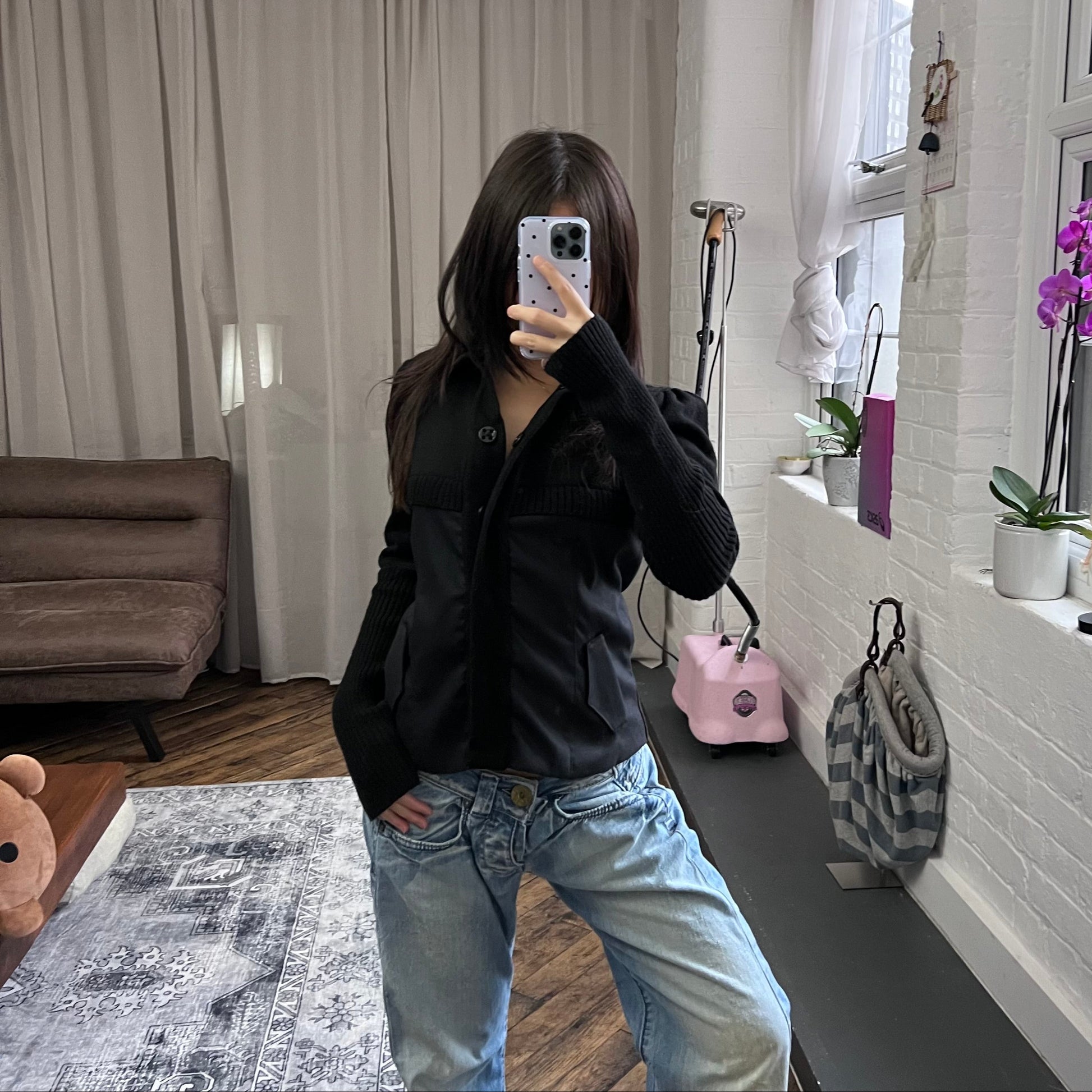 nell & me black merino wool blend mix material blocking long sleeve collared cardigan jacket