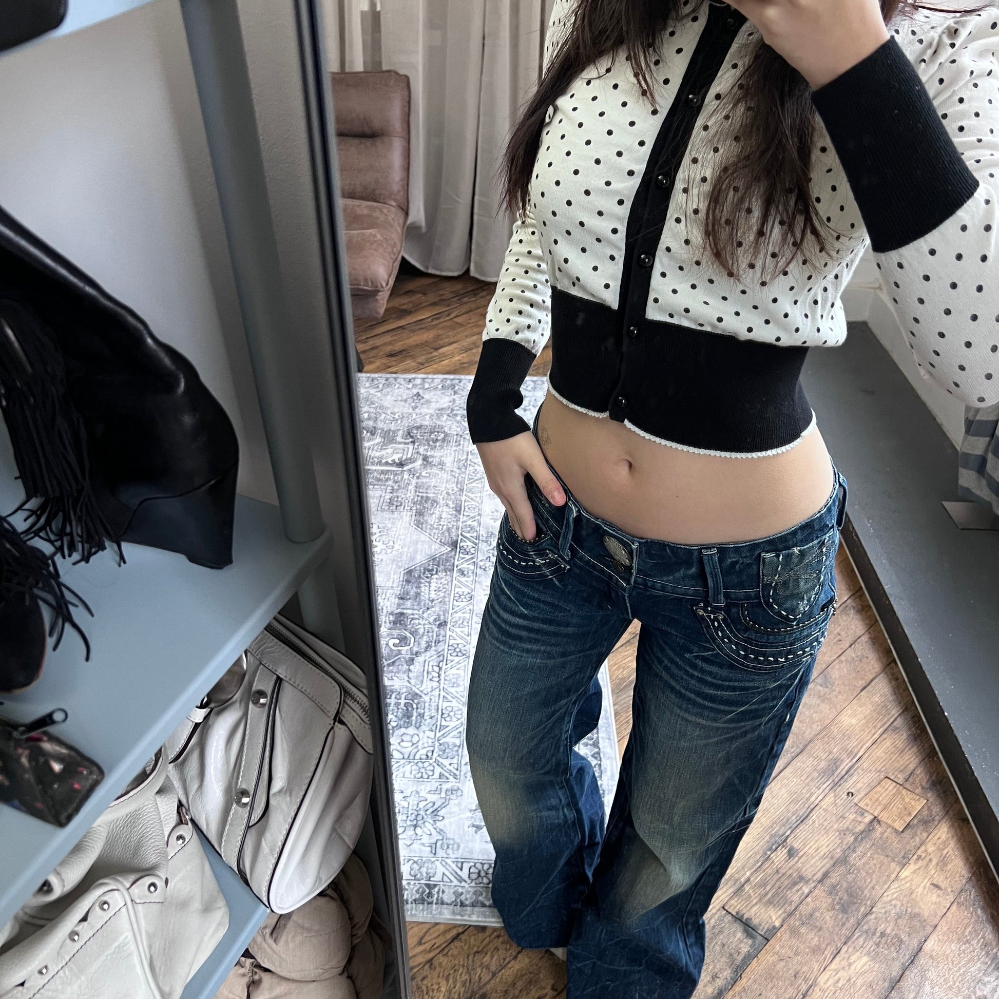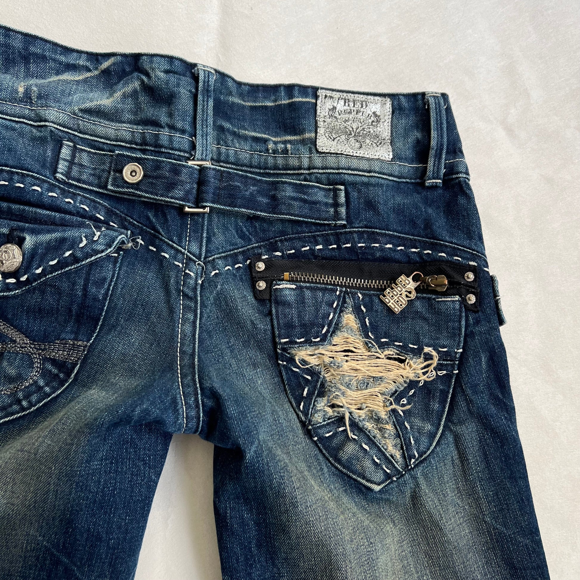 red pepper medium wash denim low mid rise distressed star wide leg trousers