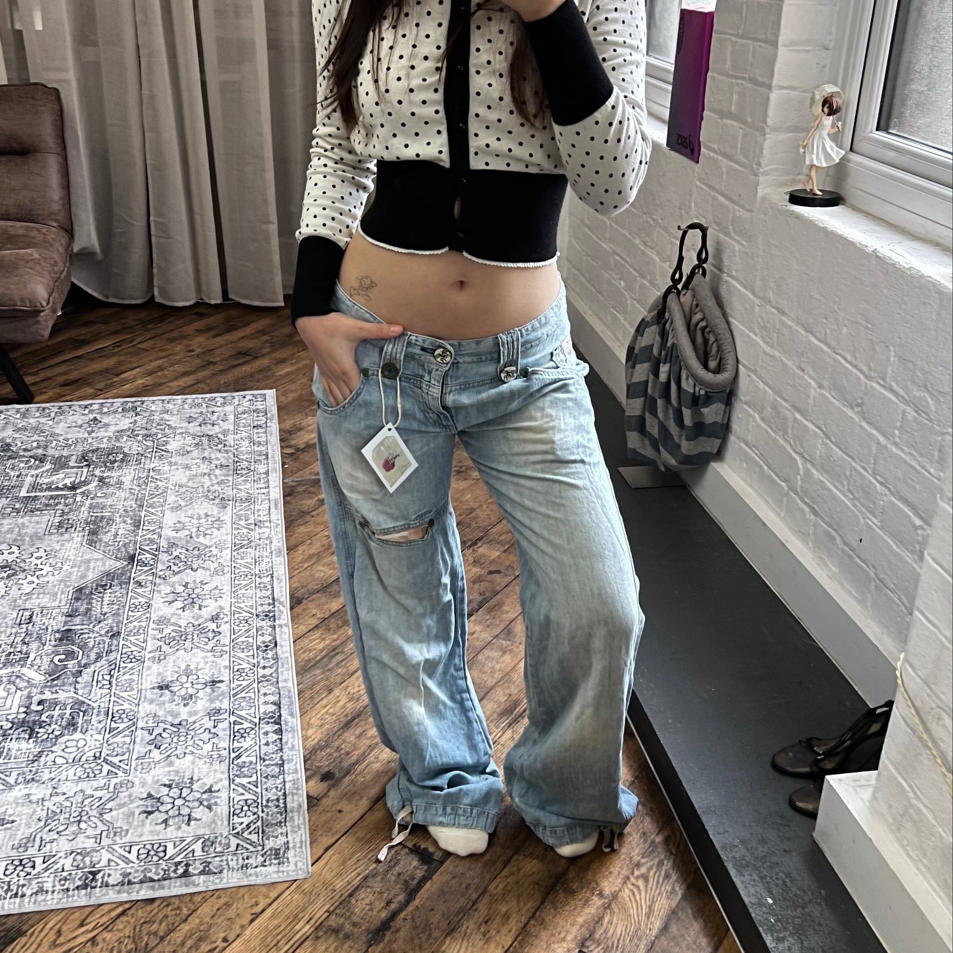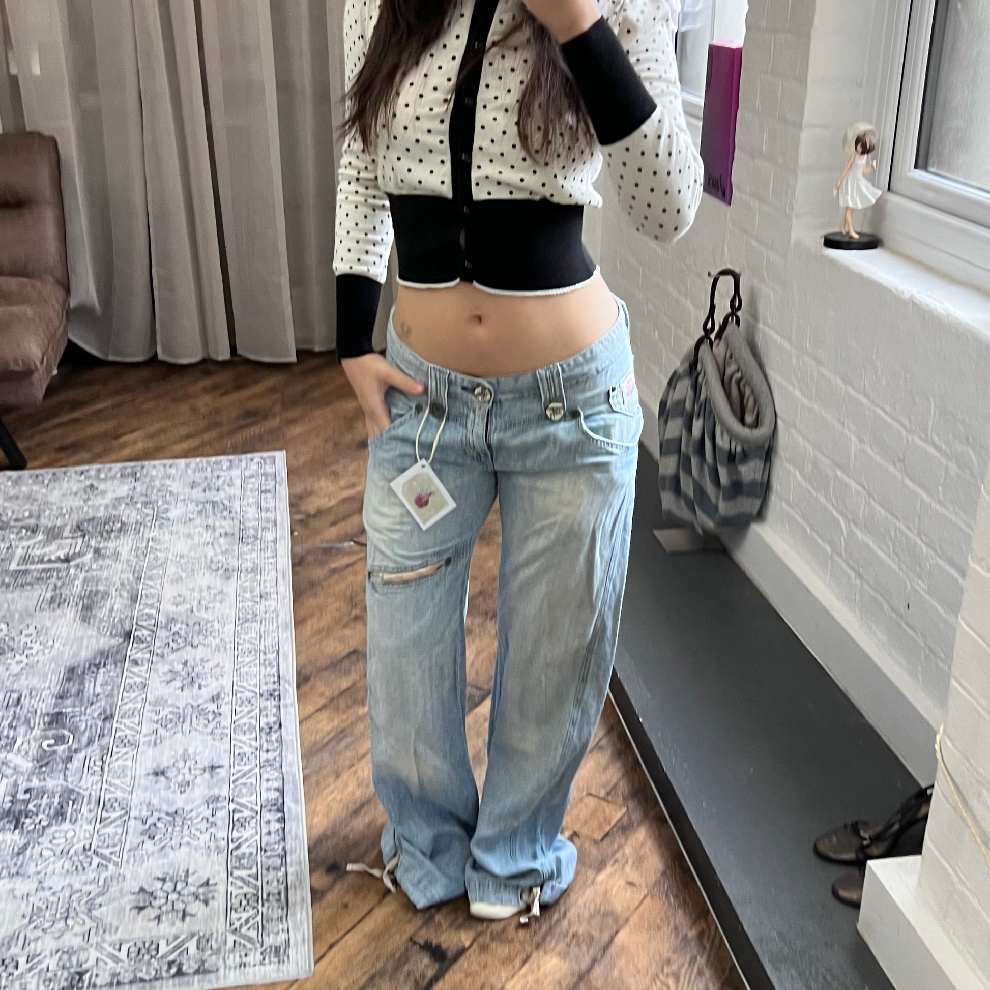 replay light wash denim baggy straight leg faux rip adjustable cinched hem jeans