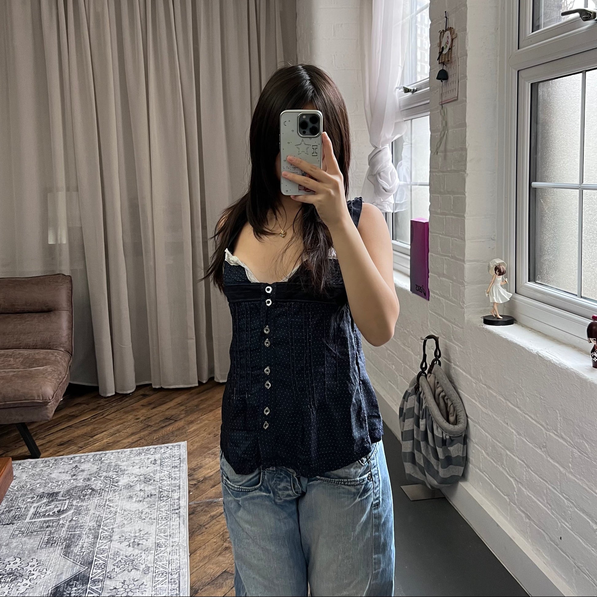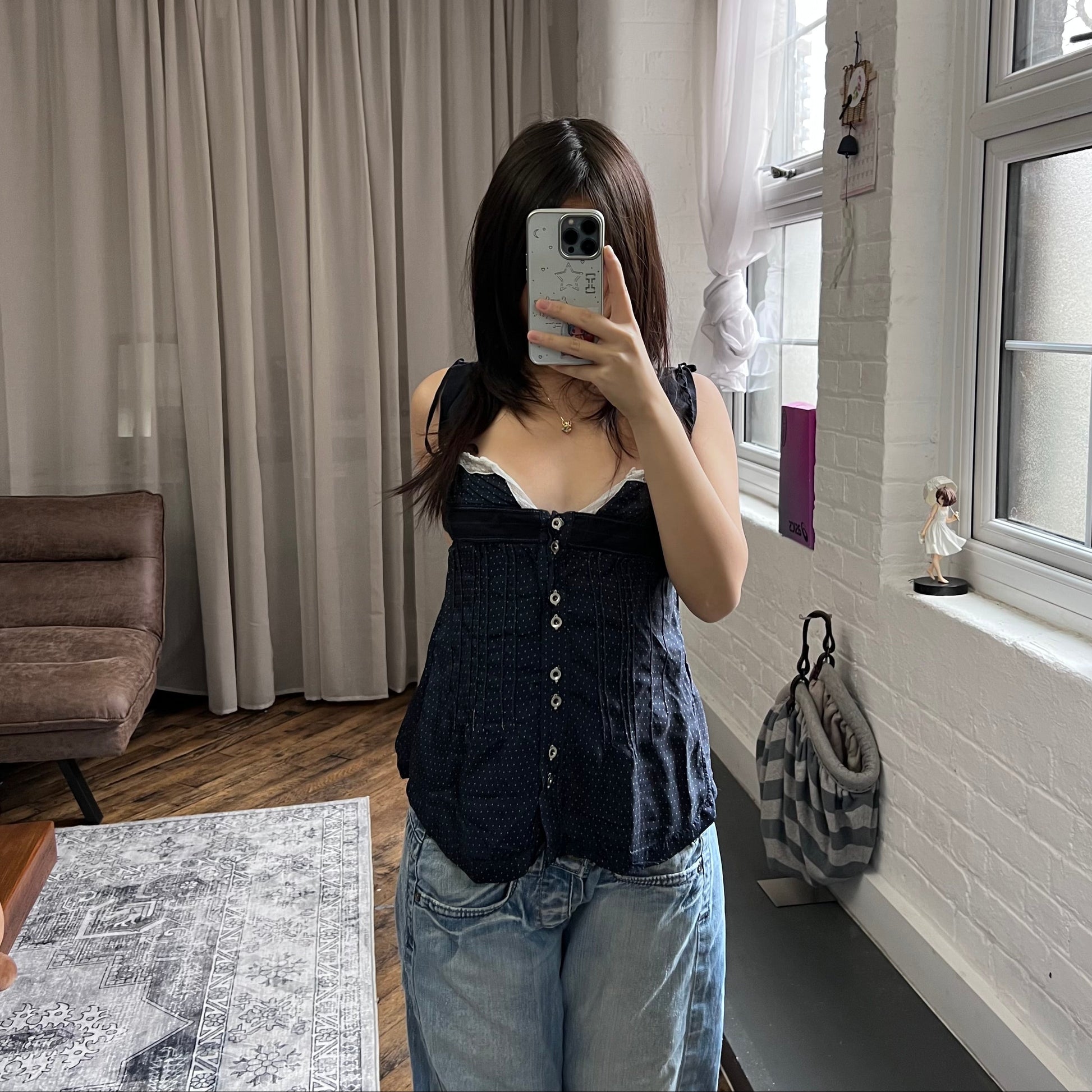 vintage high by claire campbell navy babydoll polka dot milkmaid lacey trim camisole top