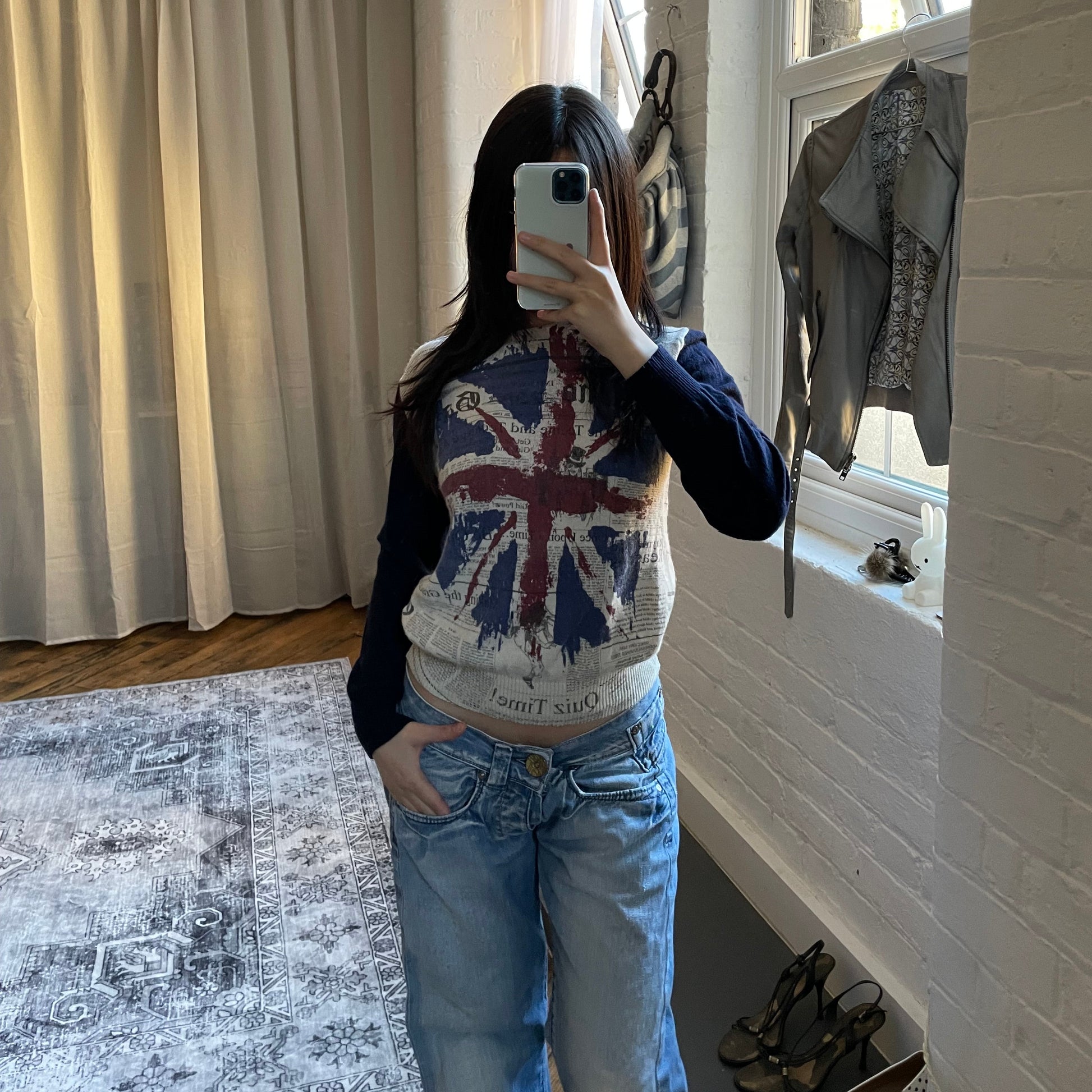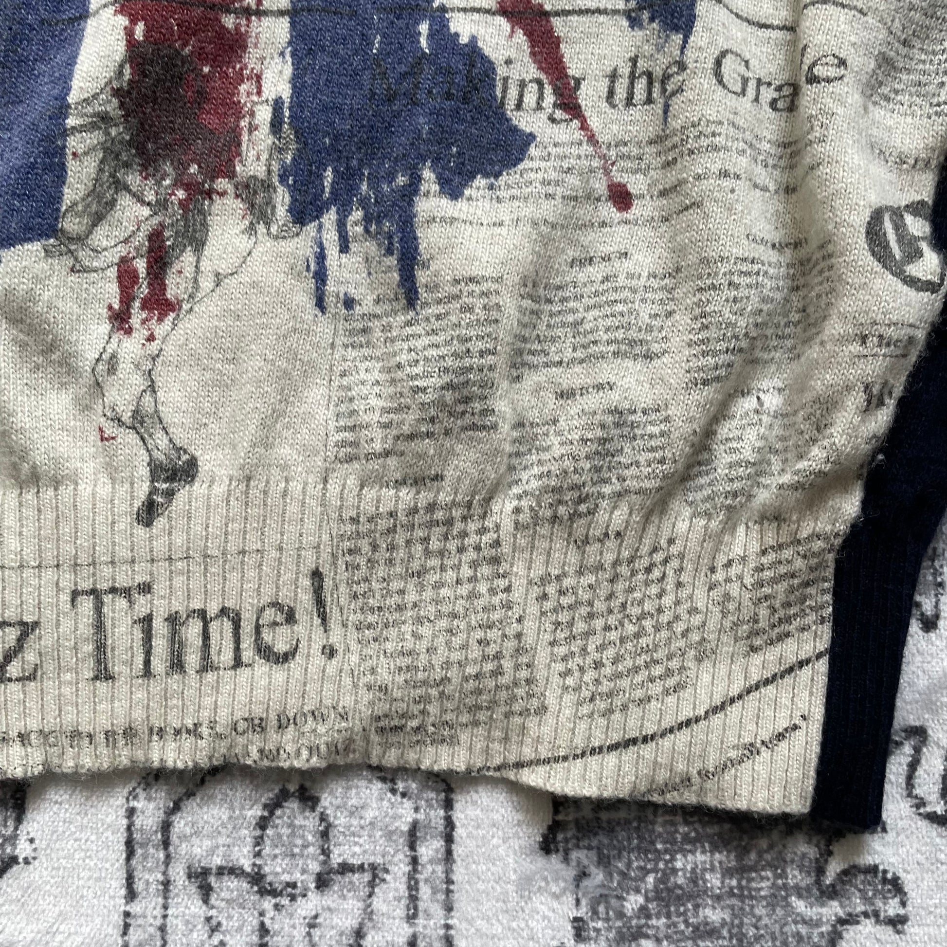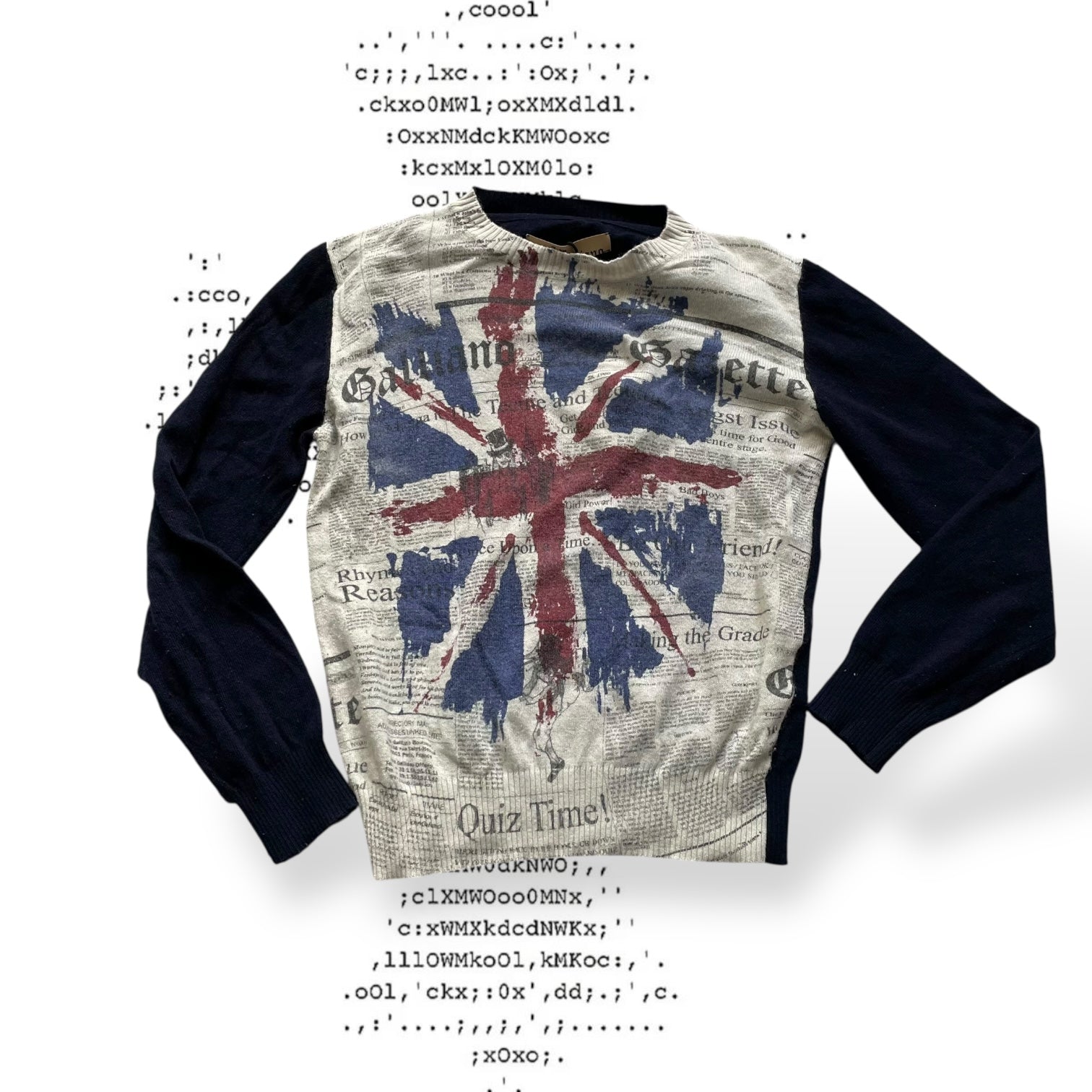 复古 John Galliano 海军蓝长袖英国国旗报纸印花羊毛羊绒混纺针织毛衣