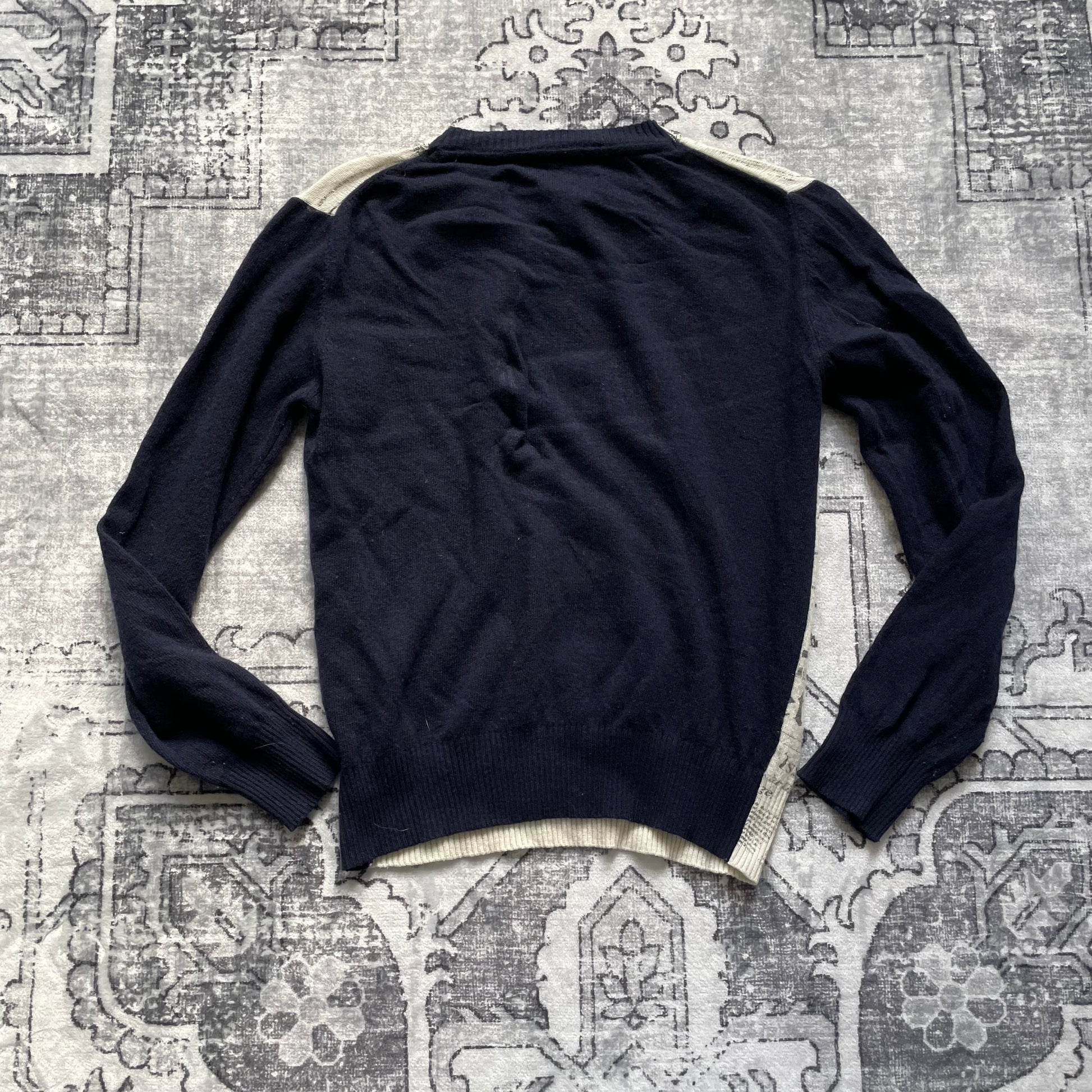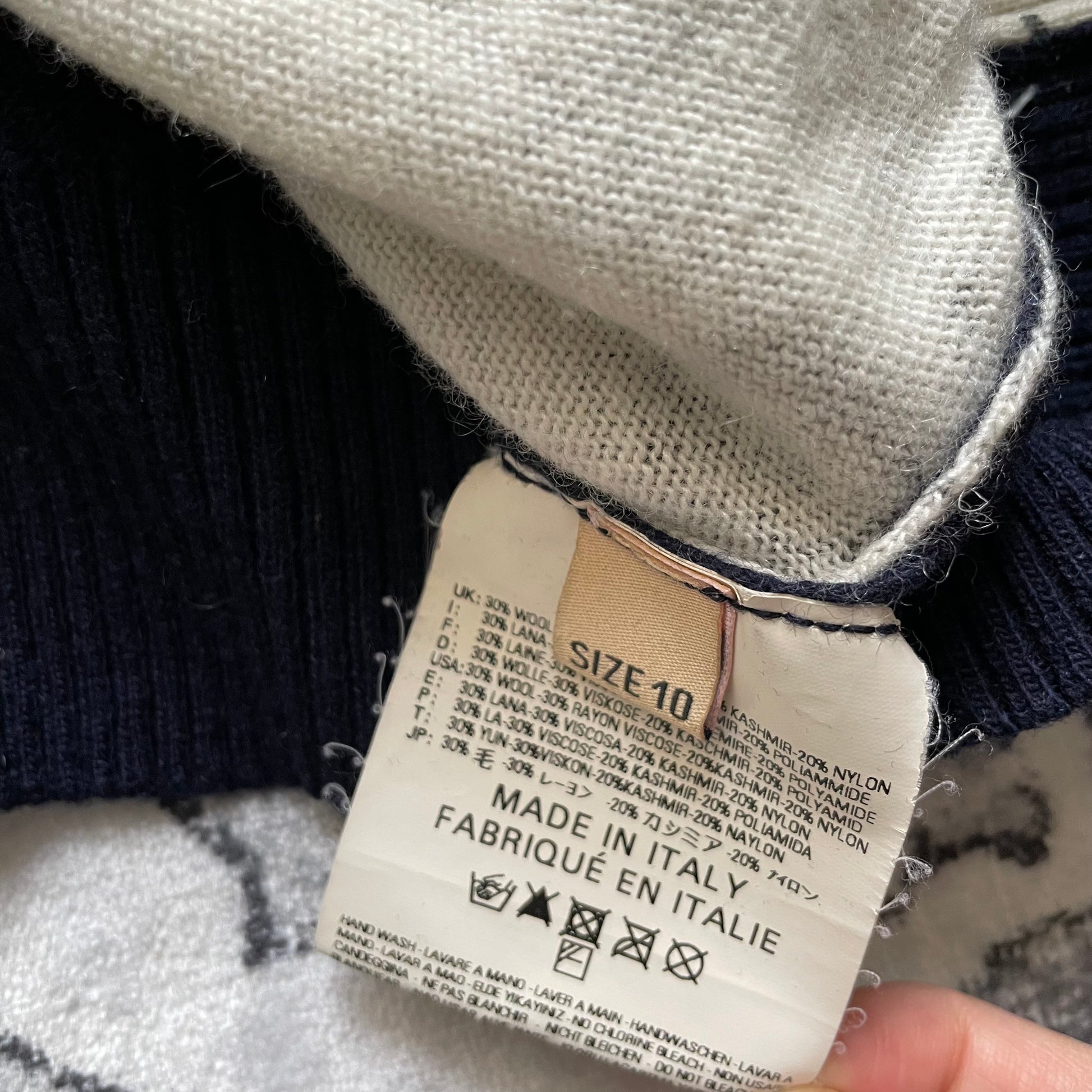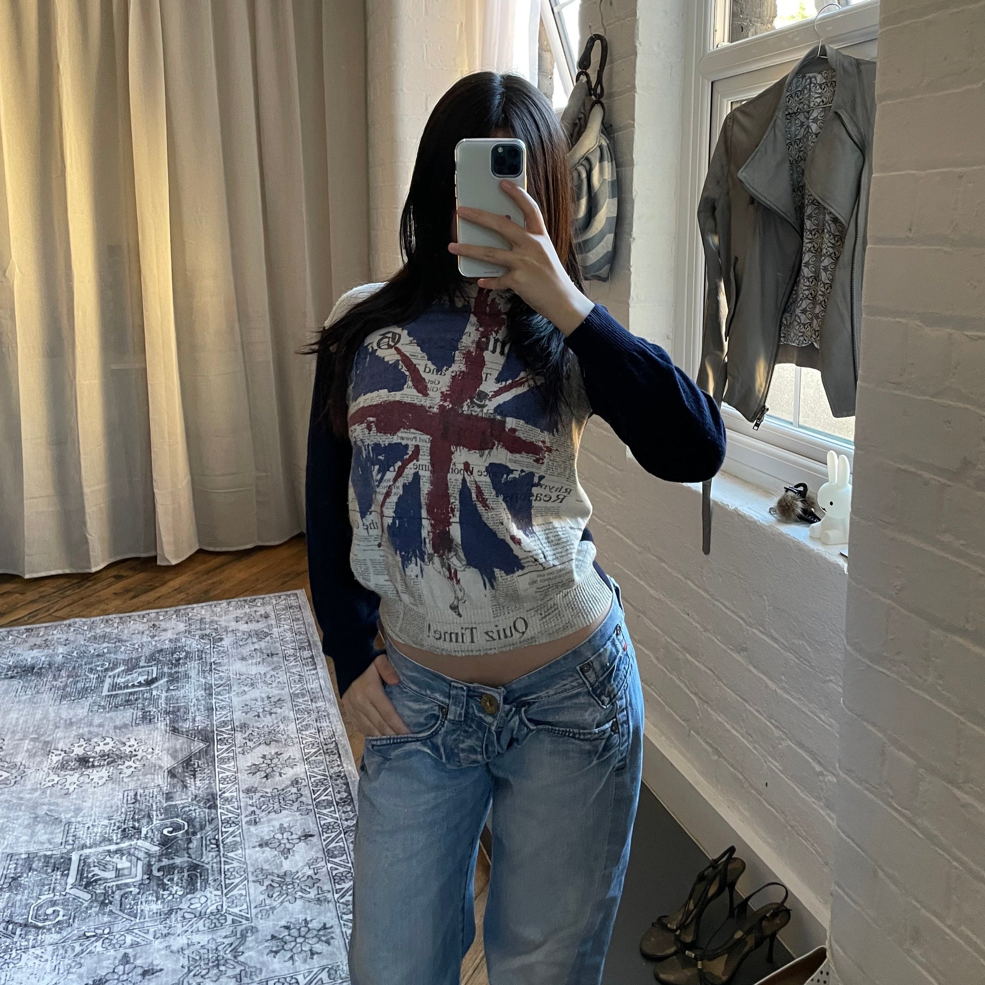 复古 John Galliano 海军蓝长袖英国国旗报纸印花羊毛羊绒混纺针织毛衣