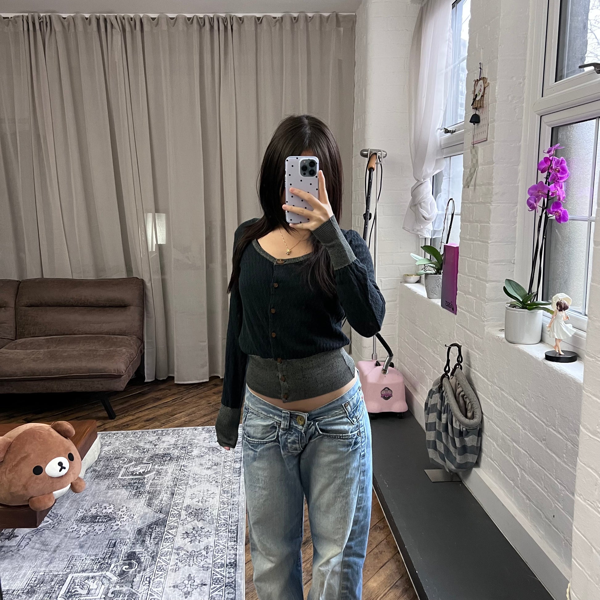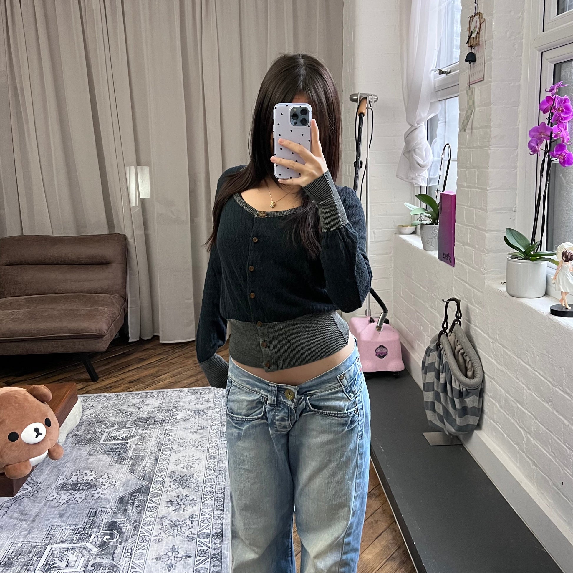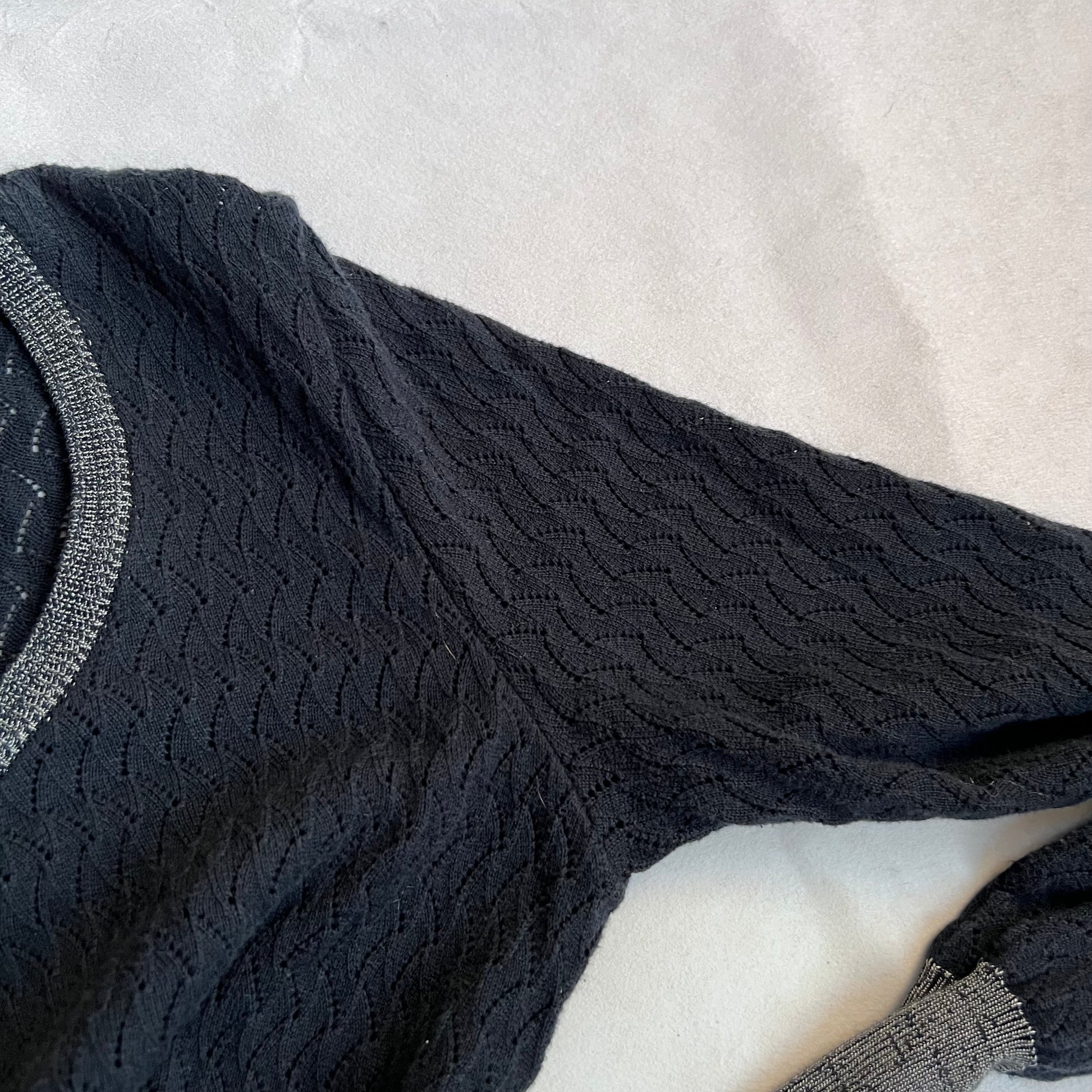 vivienne westwood red label navy grey lacey pointelle contrast long sleeve cinched waist cardigan